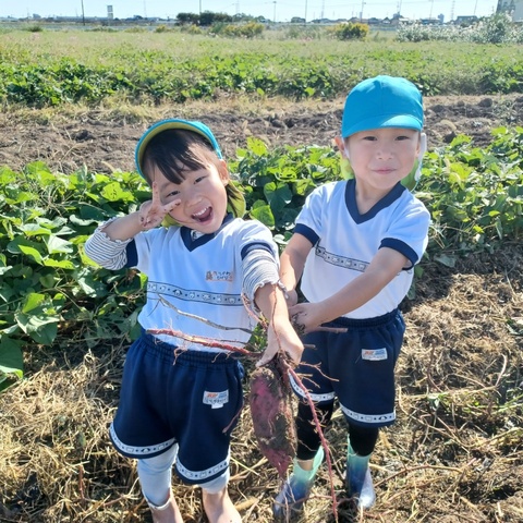 ぞう組、きりん組、ぱんだ組がバスに乗って芋ほりに出掛けました。 畑に向