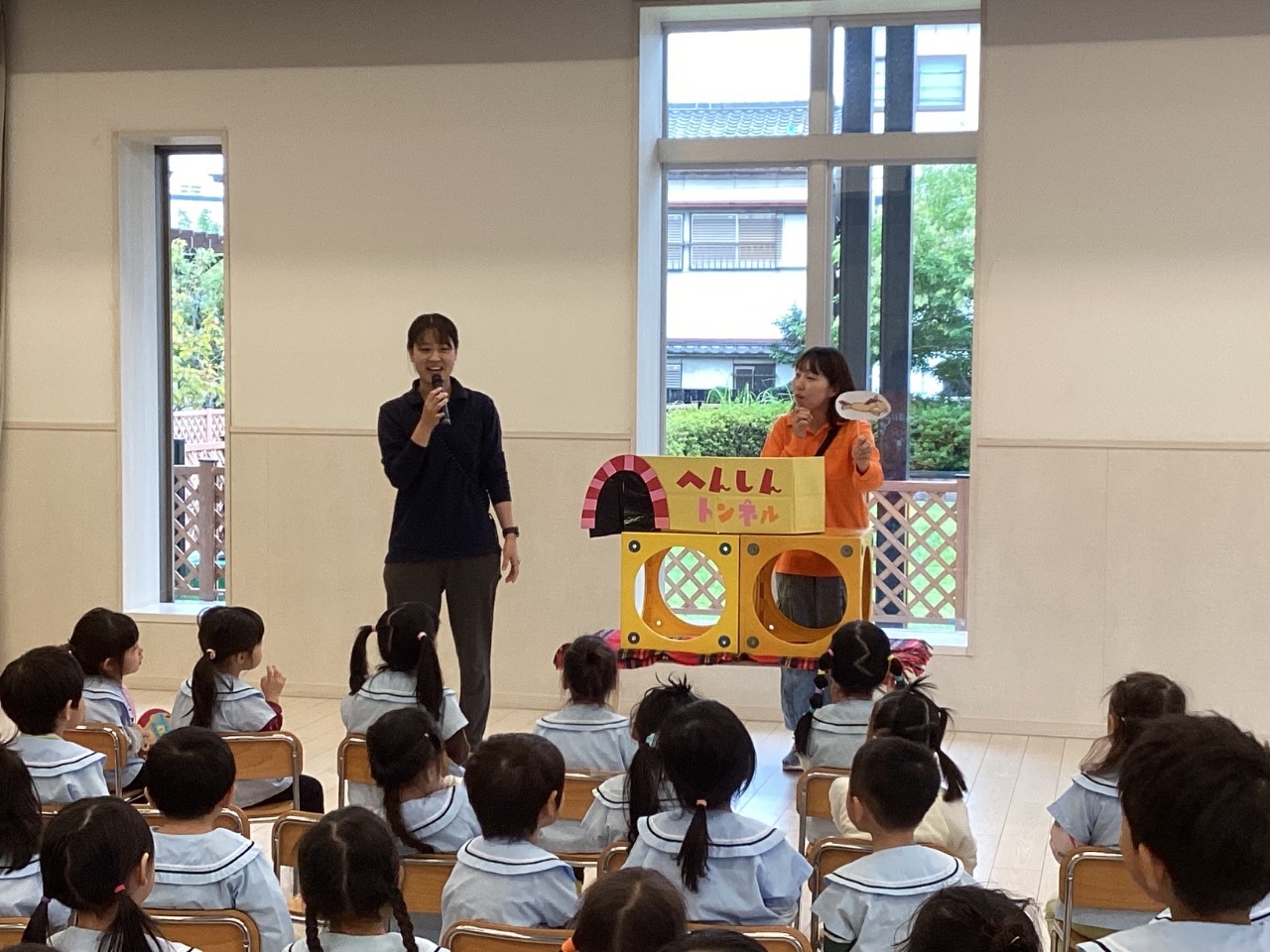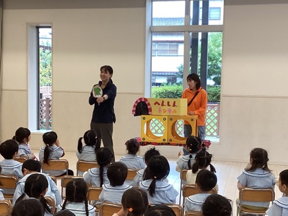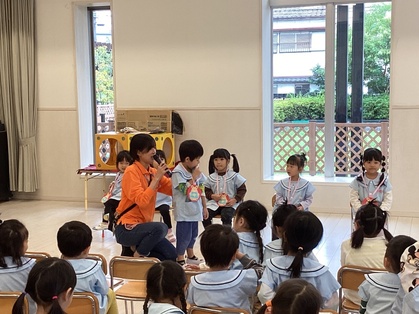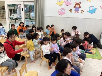 先生からの出し物は『へんしんトンネル』でした。かっぱがトンネルに入り、「かっぱ、かっぱ、かっぱ……ぱっか、ぱっか…」と言い続けていると、あるものに変身します。他にもワニや、フクロウが変身しましたよ。何に変身したか子どもたちに聞いてみてくださいね。