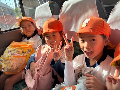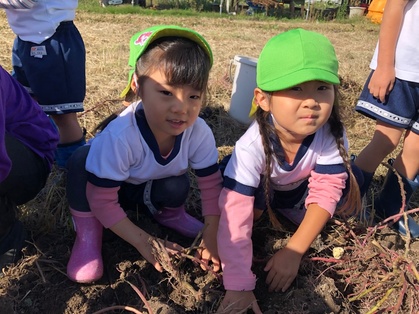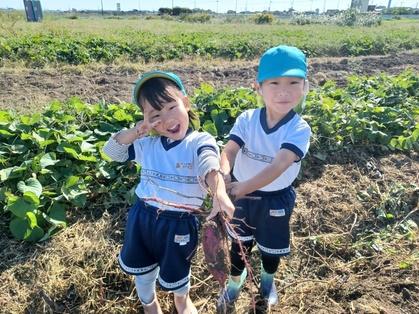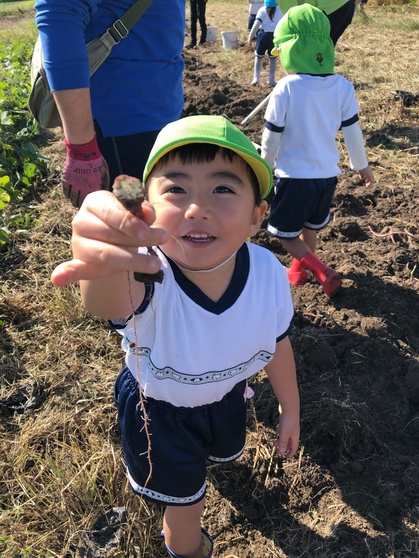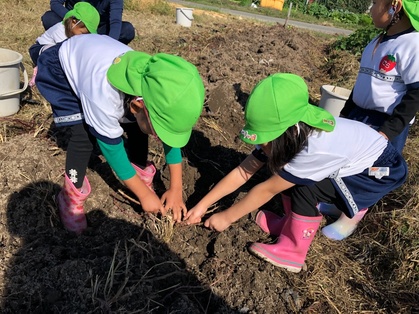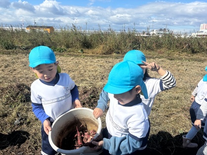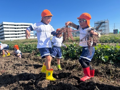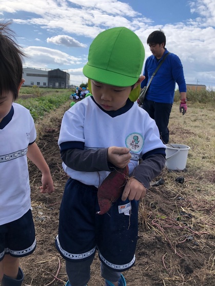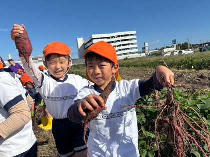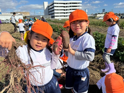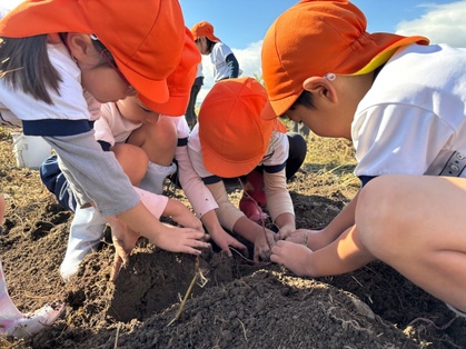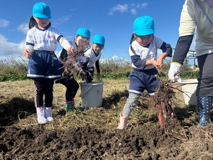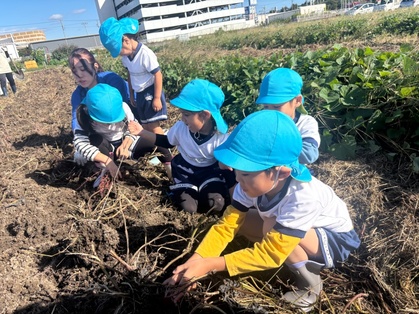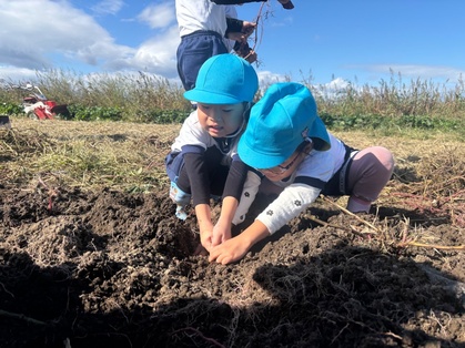 芋ほりにいきました! ぞう組、きりん組、ぱんだ組がバスに乗って芋ほりに出掛けました。 畑に向かうバスの中から、「おおきいいもあるかな」「いっぱいとるぞ!」と楽しみにしている様子で、期待を膨らませていました。 畑に到着し、やる気満々の子どもたち。土の中にさつまいもを見つけると嬉しそうに掘ったり引っ張ったりして、見事に抜けると「せんせい、みて!」「やった!」と大喜びでした。 【ぞう組】 【きりん組】 【ぱんだ組】