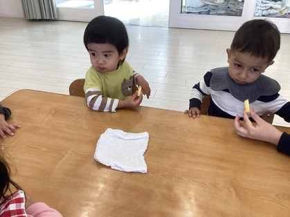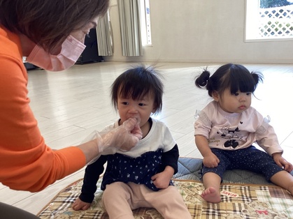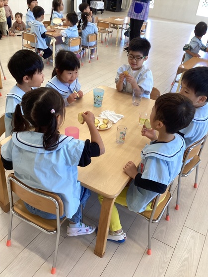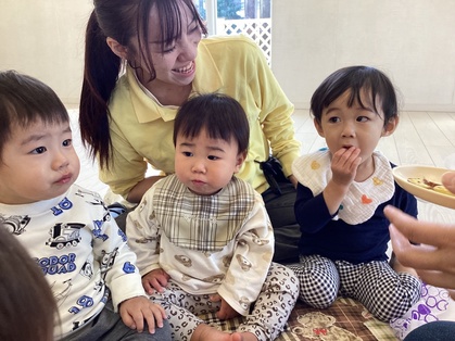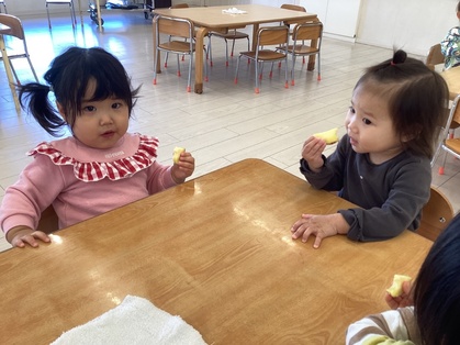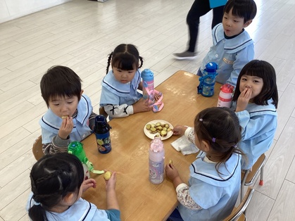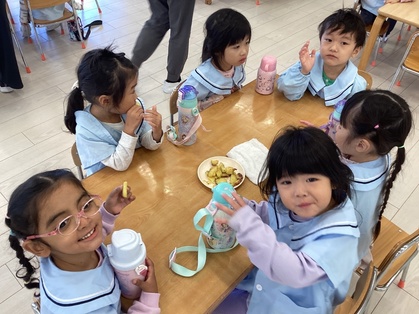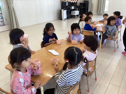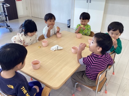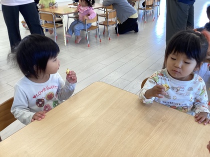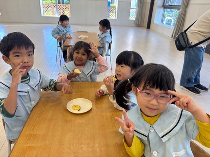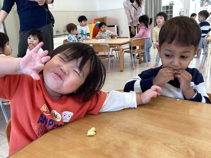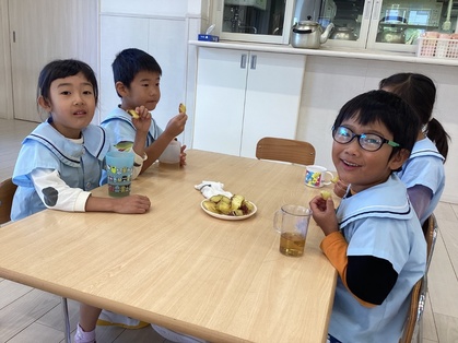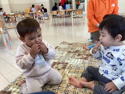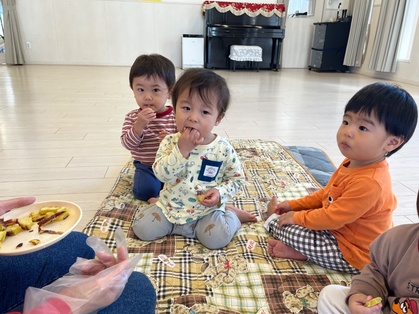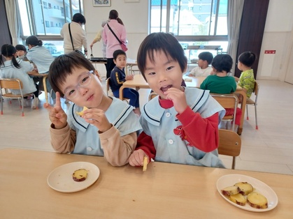 収穫したさつまいもを食べました! 芋ほりの次の日、収穫したさつまいもをホットプレートで焼いて食べました。 「いいにおい!」「あまい!」「めちゃくちゃおいしい!」と大好評で、おかわりをする子もたくさんいました。 乳児クラスのみんなも、喜んで食べていました。