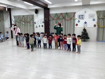 ひよこ組、りす組は一緒に部屋でクリスマス会を行いました。