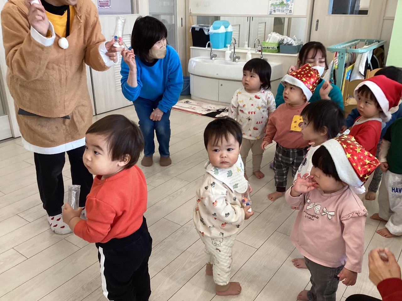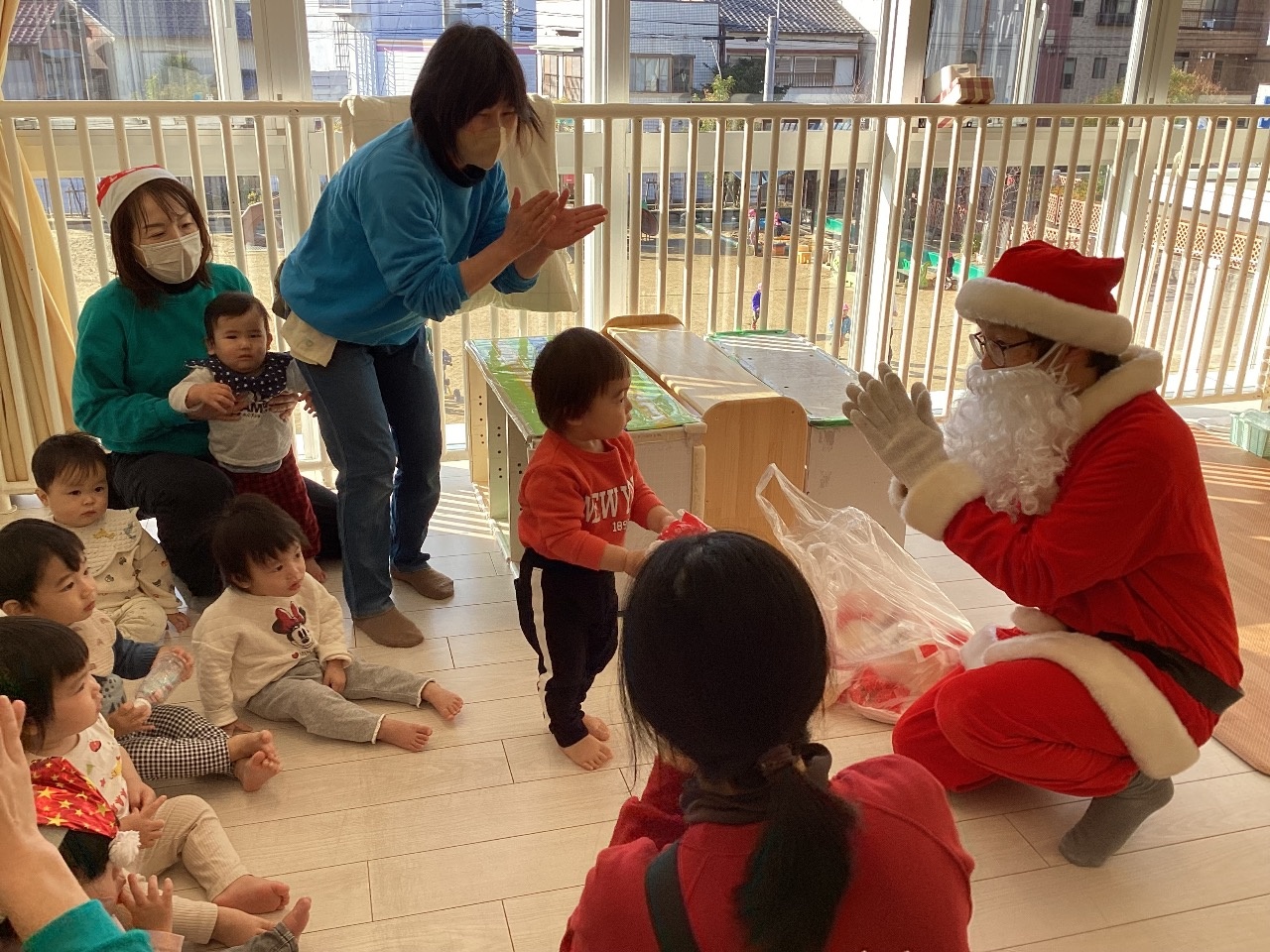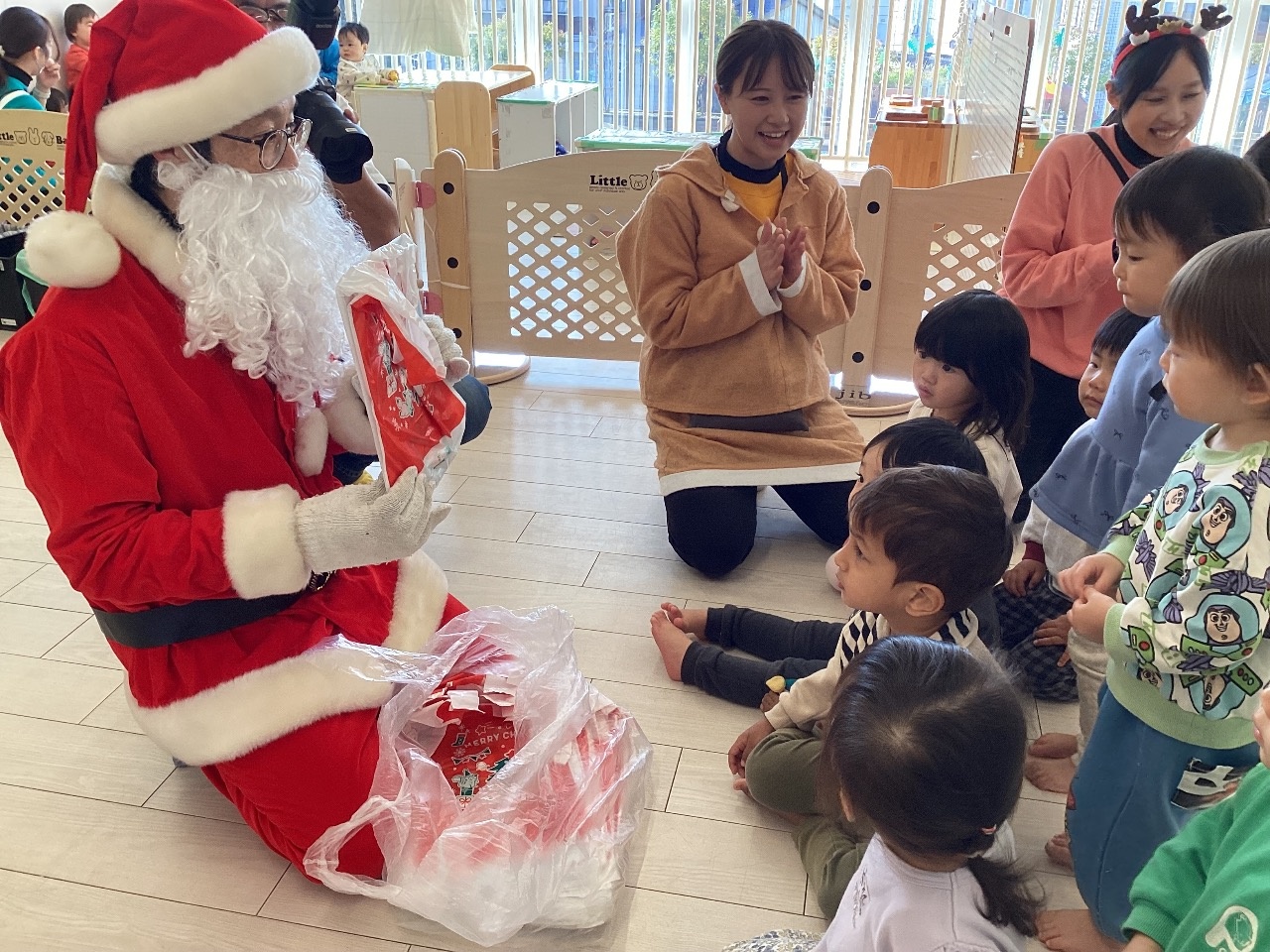 サンタさんの登場に、「わぁ~」と大喜びの子もいれば、びっくりしてキョトン顔の子など様々でした。