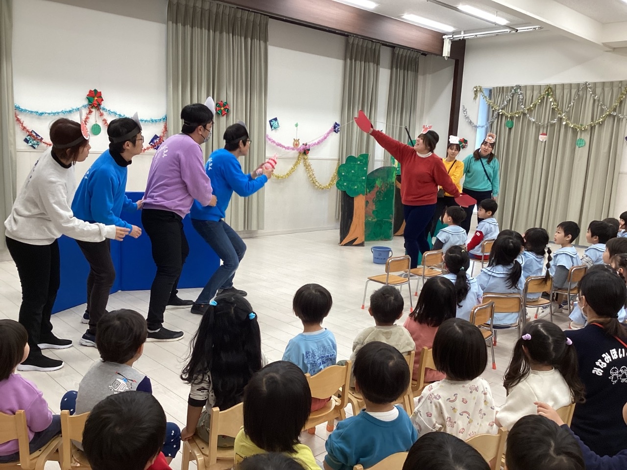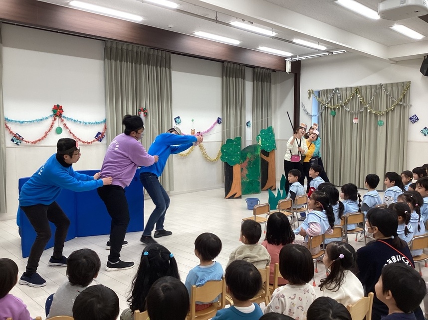 先生たちからのプレゼントは、劇の出し物。「わぁーい つられたよ」というお話で、森の生き物が釣り竿で釣るけど海の生き物は釣られないようお互いが仲間を呼ぶ内容でした。先生たちが出てくるたびに「〇〇せんせいだ〜」と盛り上がっていました。