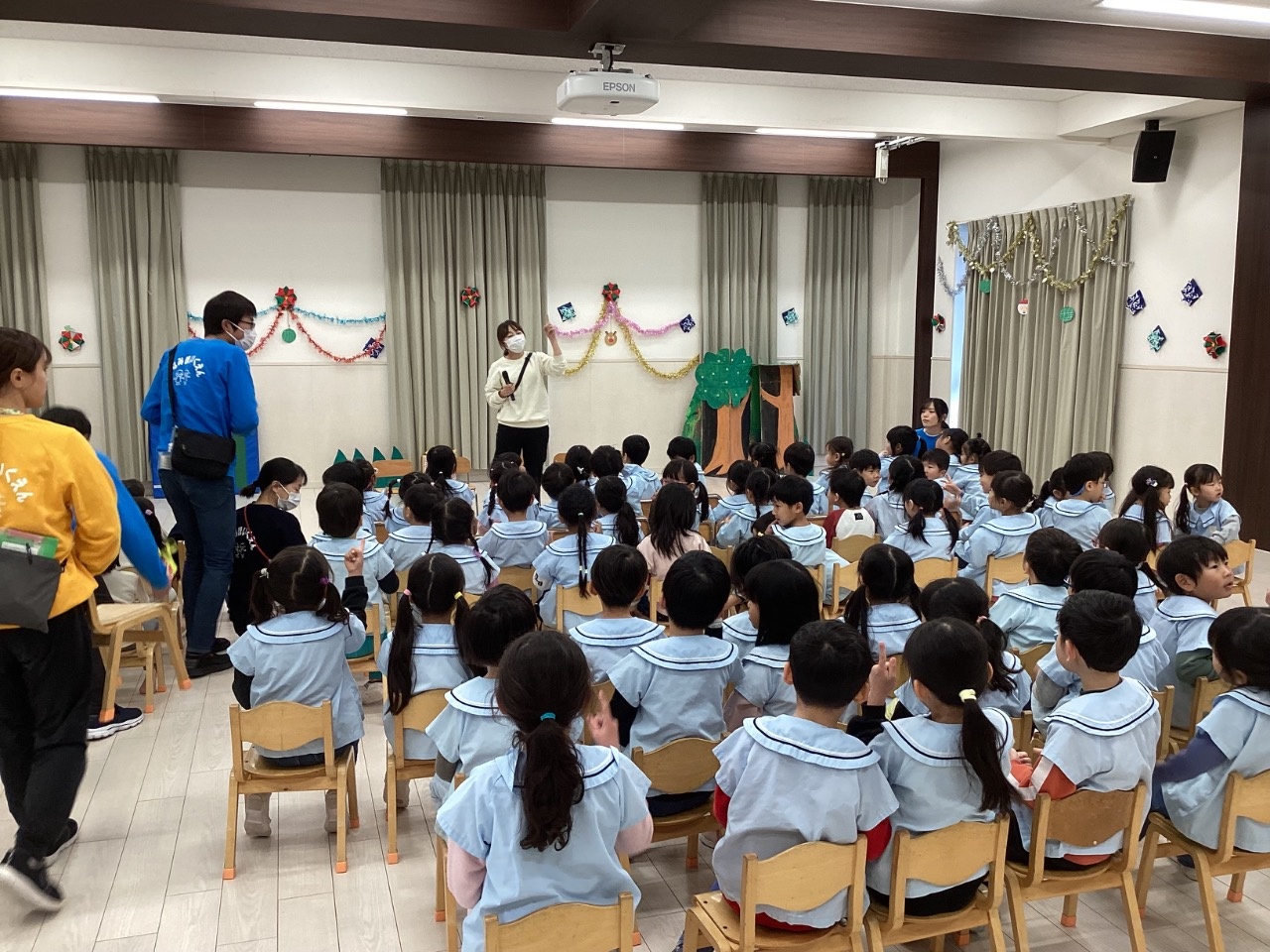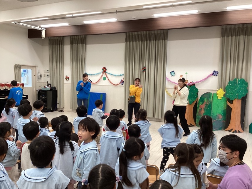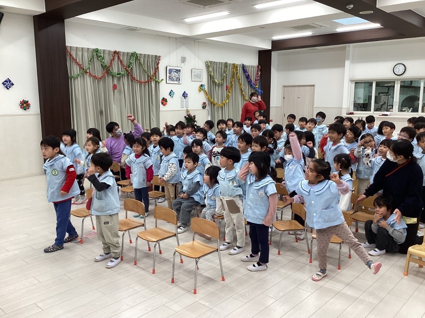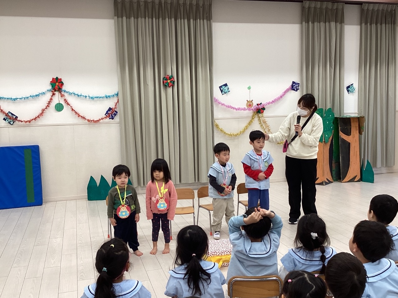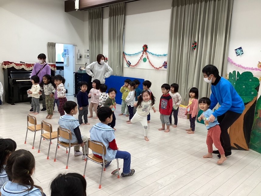 最後は『あわてんぼうのサンタクロース』をみんなで歌いました。先生たちのダンスに合わせて子どもたちもノリノリで踊っていました。12月生まれのみんな、お誕生日おめでとう!