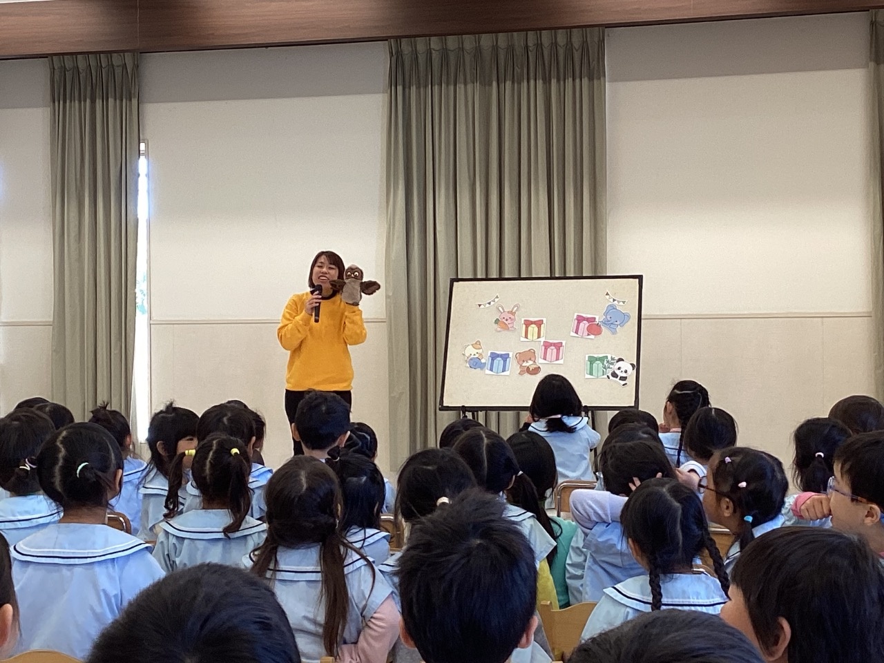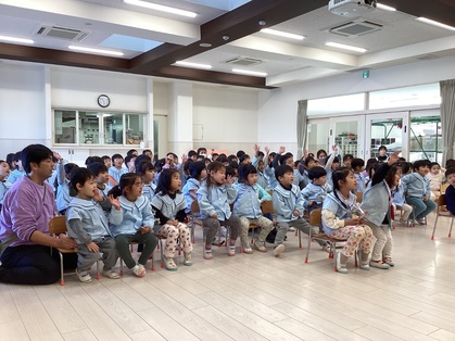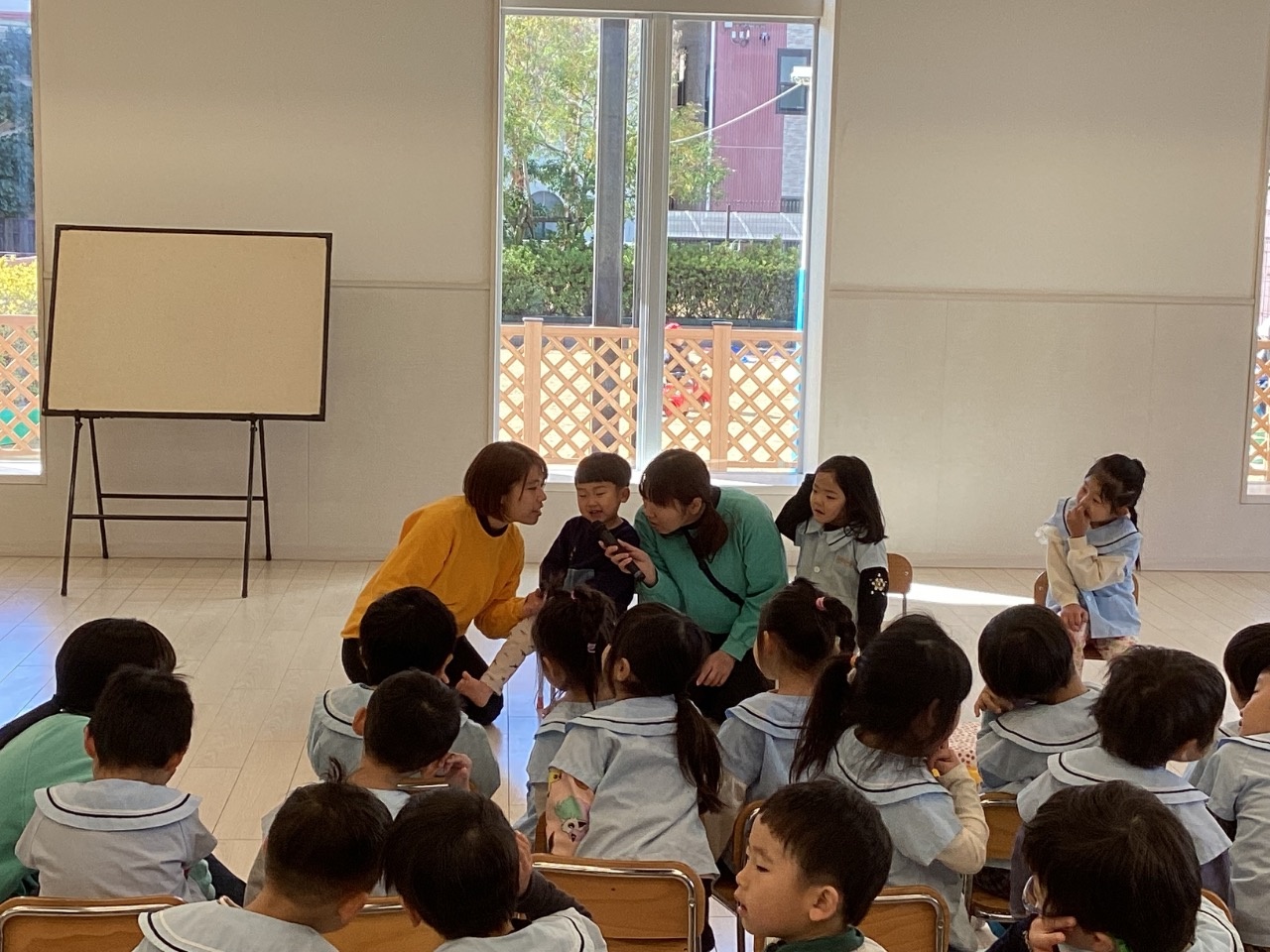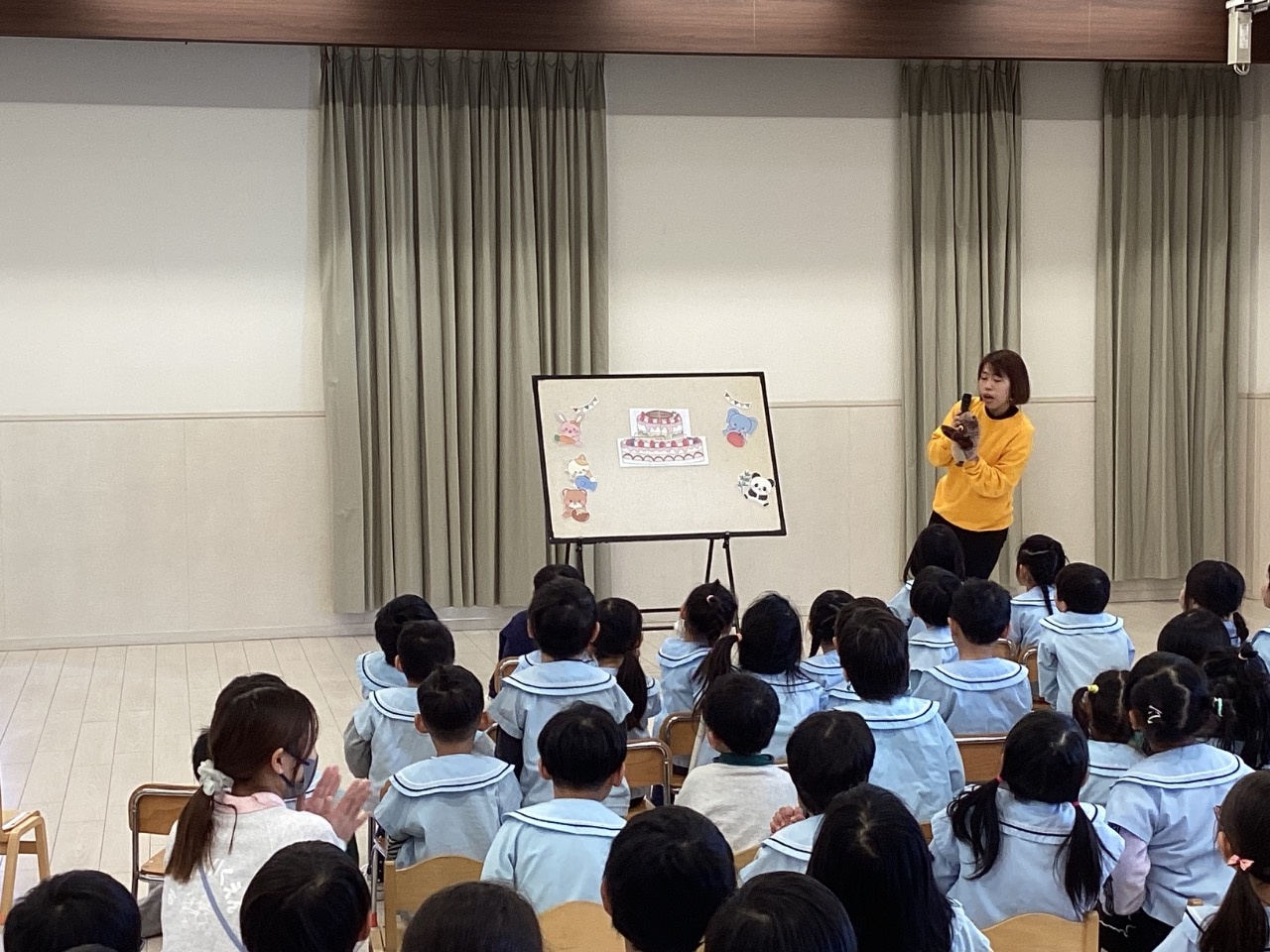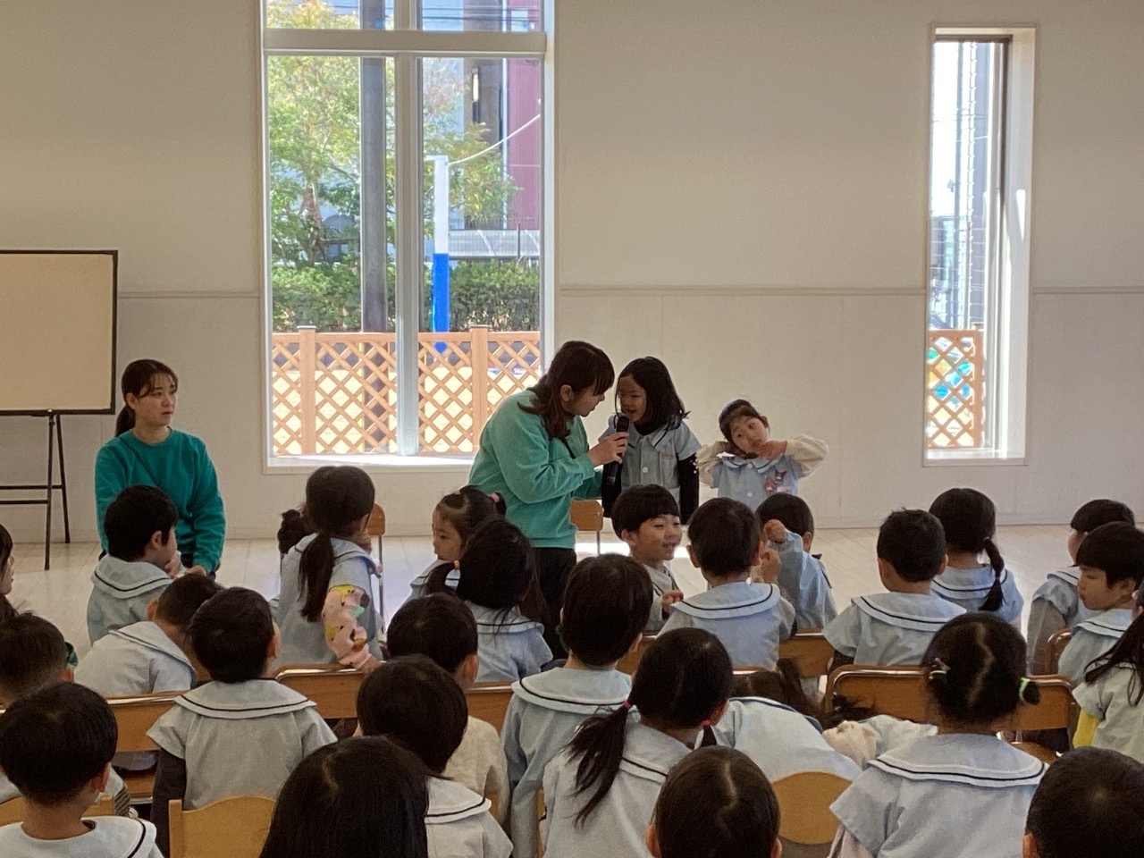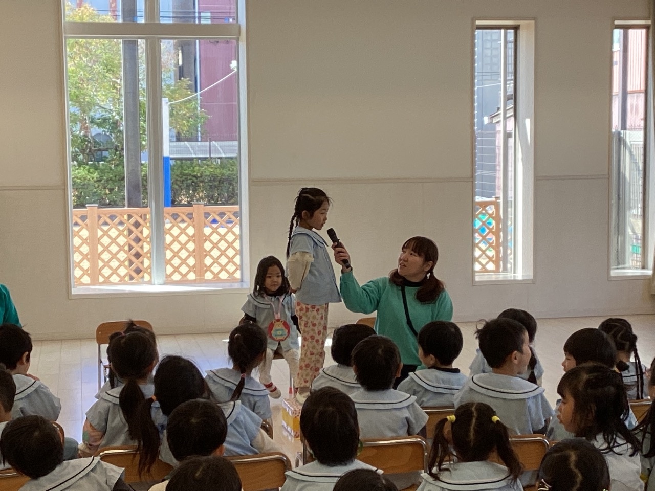 今日は3人の友だちをお祝いしました。みんなの前に出るのは少し恥ずかしそうでしたが、先生や友だちの質問に答えてくれました。マイクで答えていくことが嬉しいようで、マイクに口を近づけて話す姿が可愛かったです。