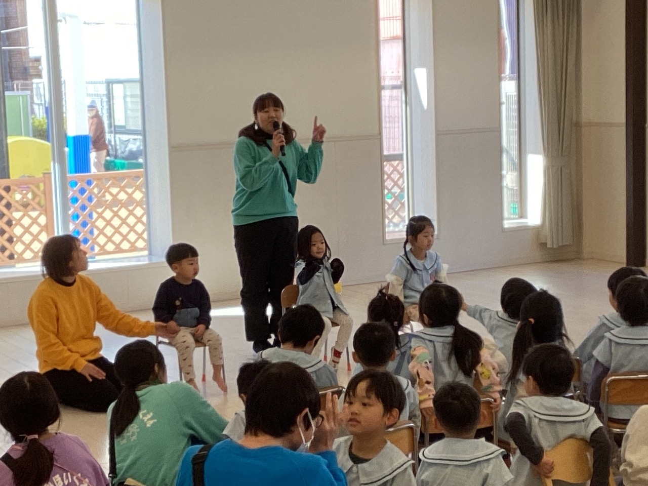 1月の誕生会が行いました。みんなで『ペンギンマークの百貨店』の手遊びをしてスタートです。
