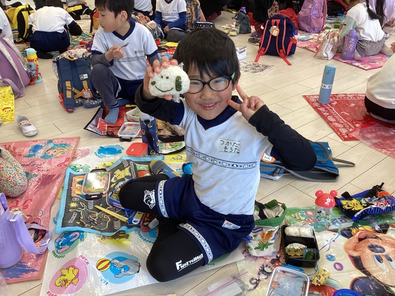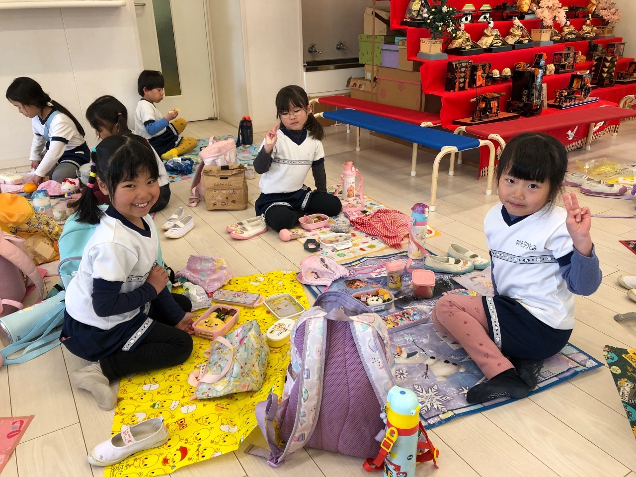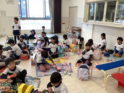 ドッジボール交流会のあとは、ほうしょう保育園とちゃやひるず保育園がみなみ保育園へ帰ってきて、みんなで一緒にお弁当を食べました。帰ってくる間「おなかすいた~」「おべんとう、からあげはいってる!」と、とても楽しみにしていましたよ。