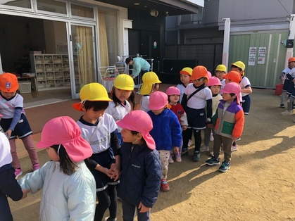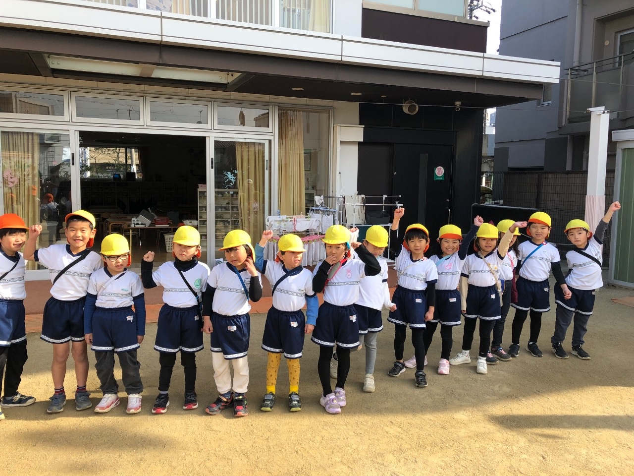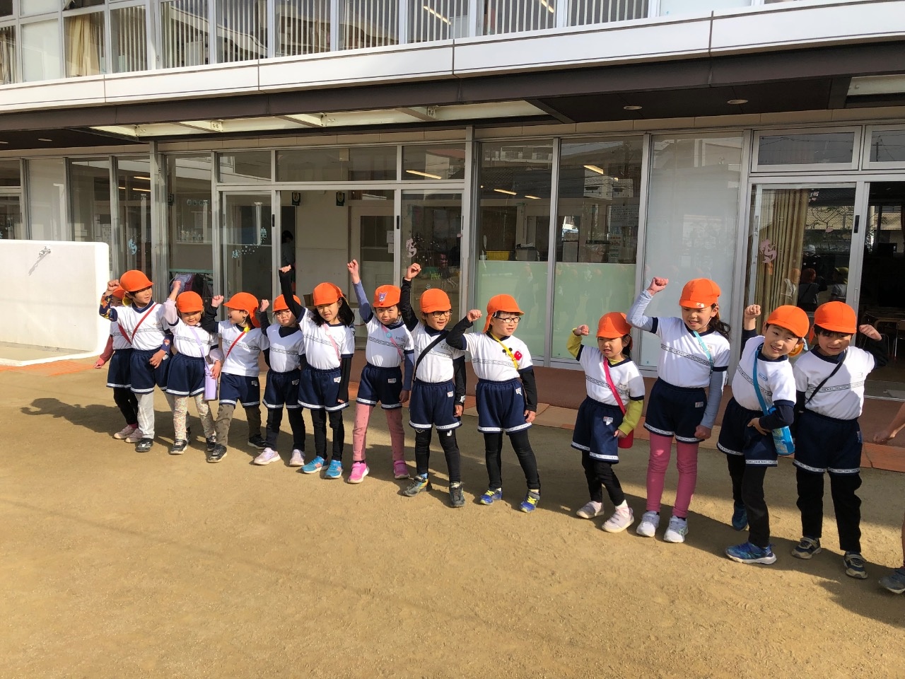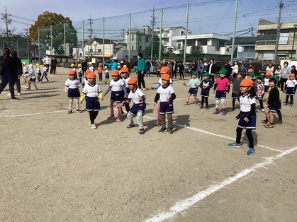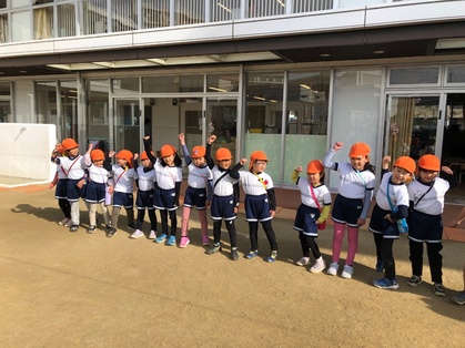 みなみ保育園のみんなで「がんばるぞー!」と気合いを入れて、うさぎ組さんと手をつないで道徳公園へ向かいました。