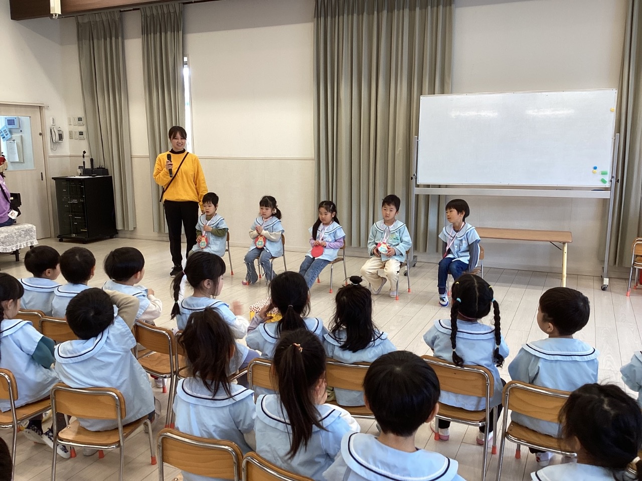 次は先生の出し物です。出し物は、右から左へ流れていくものを当てるゲームです。ヒュンっと素早く移動していくのを見て「えぇ〜っ?」「なんか、とんでった!」と大盛り上がりでした。最後に2月の「2」の飾り付けも登場し、「かわいいね」と喜んでいました。
