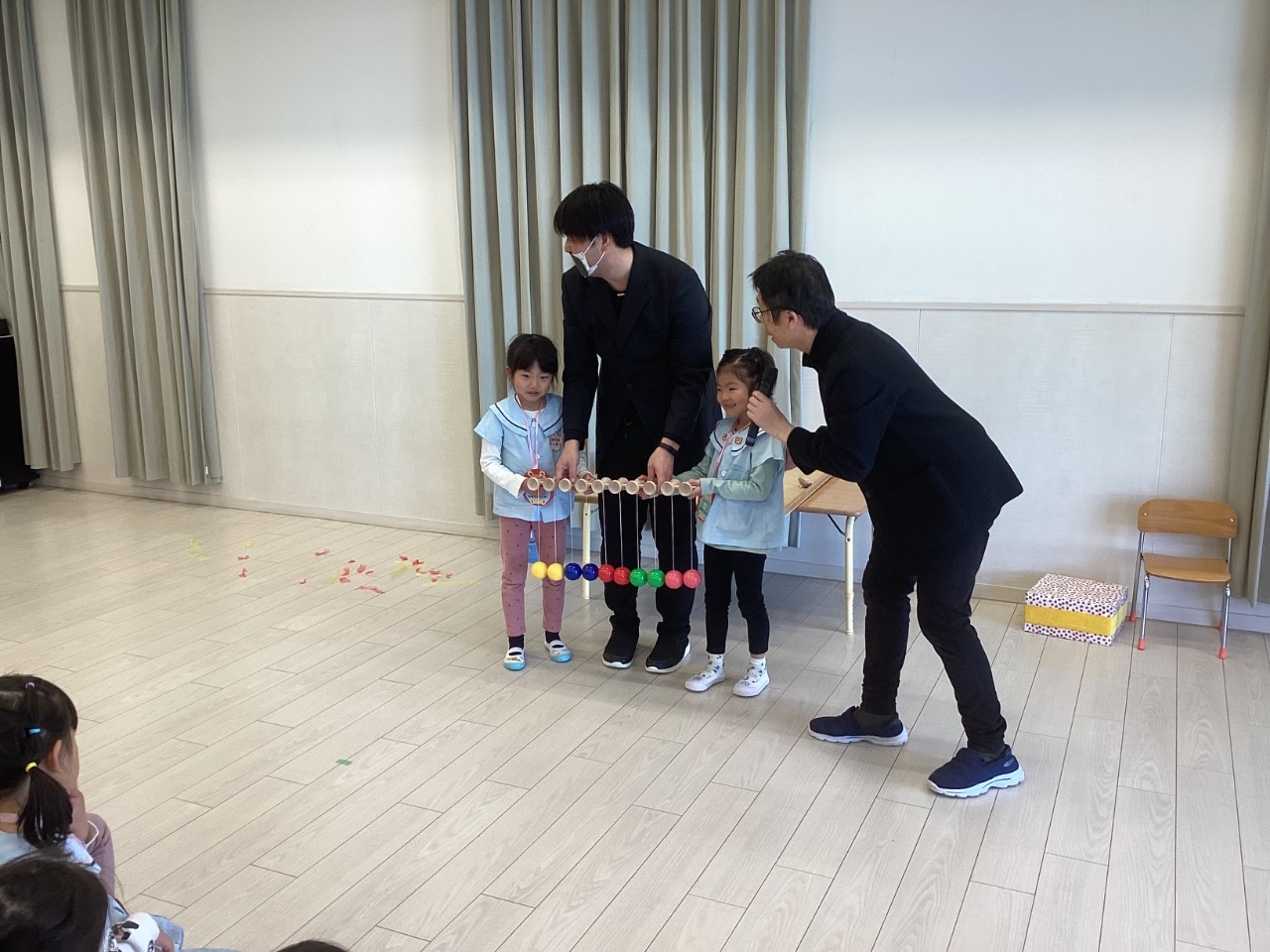 他の保育者も飛び入り参加して、輪投げやコマ、けん玉などに挑戦しました。
