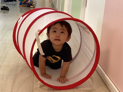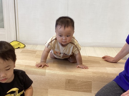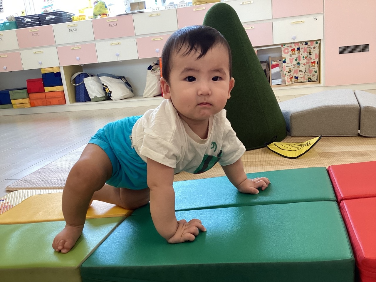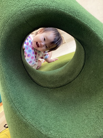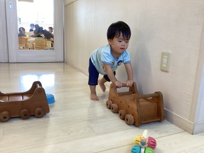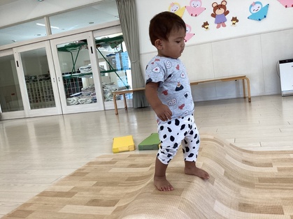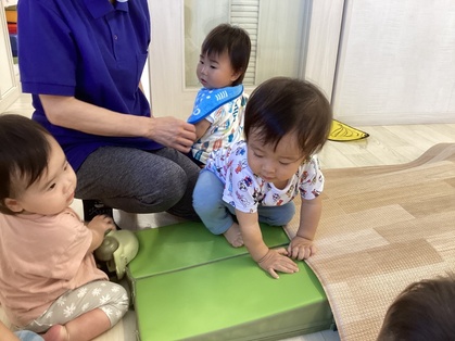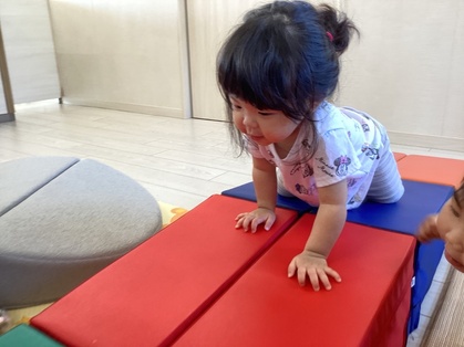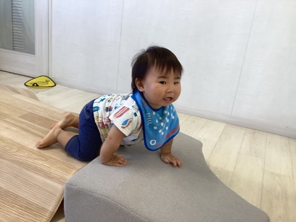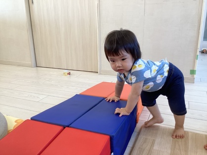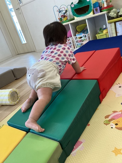 トマトグループ(低月齢)の友だちは、体を動かす事が楽しくてハイハイで段差を登ったり、よちよちと歩いて探索を楽しんでいます。歩けるようになると、クッション積み木がお気に入りですぐに登ったり積み木の上を歩こうとするようになってきました。ハイハイの丘が好きで順番に素敵な笑顔を見せてくれます。