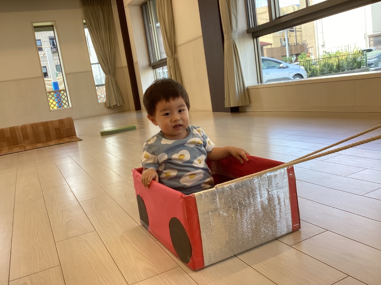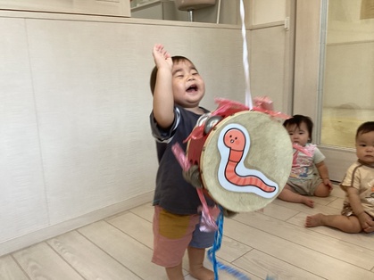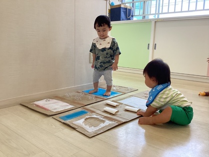 ちくわグループ(高月齢)の友だちは、しっかりと歩けるようになってきました。コンビカーに乗ったり、クッション積み木を歩いて渡ったりと活発に動いている姿が多くなってきました。色々な玩具にも興味を持ち始め、保育屋が準備をした車の段ボール、タンバリンに興味津々です。タンバリンを叩くと音に興味があり子どもたちは大喜びでした。