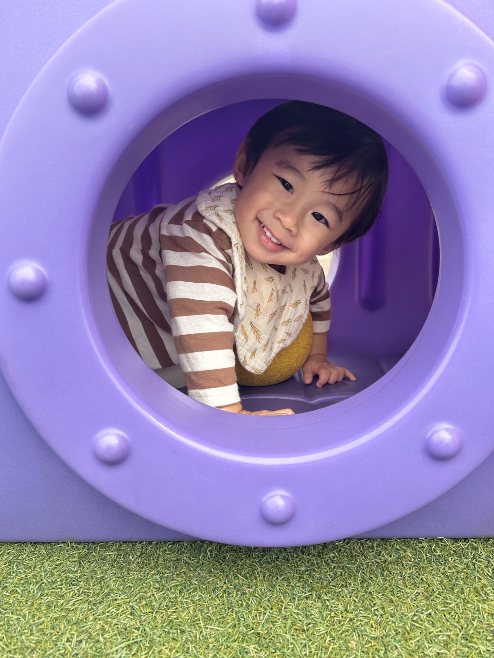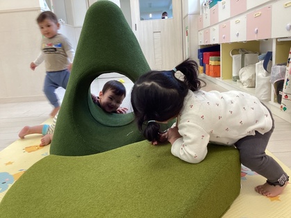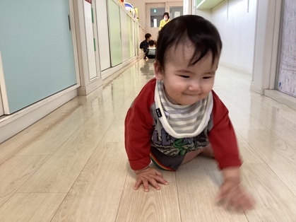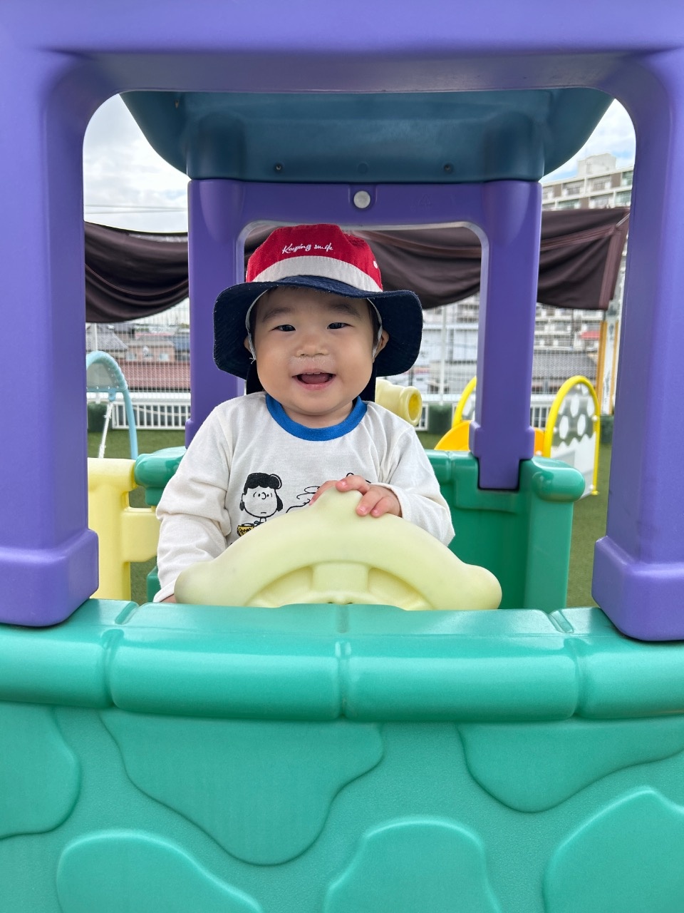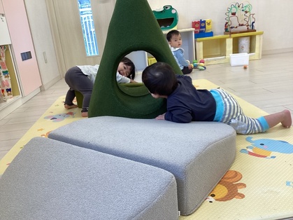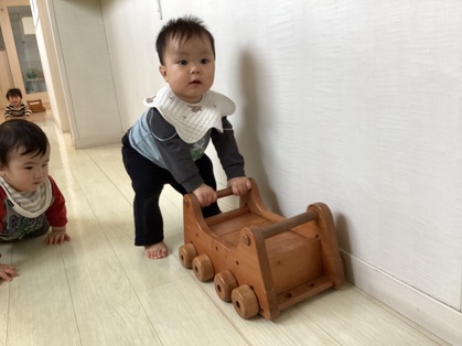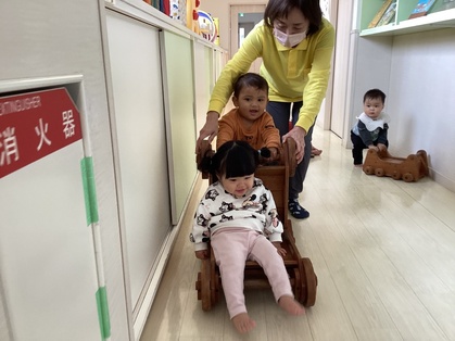 とまとグループ(低月齢)さんも園庭に出てコンビカーに乗って遊んだり、廊下や保育室で友だちと玩具を渡し合いっこをしたり遊んでいる姿があります。