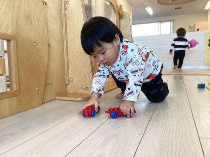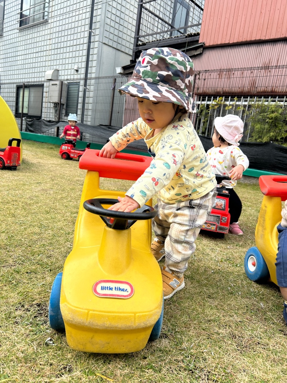 コンビカーでは〝プップー〟とクラクションを鳴らして遊んだり、友だちが乗っているコンビカーを押している姿もあります。