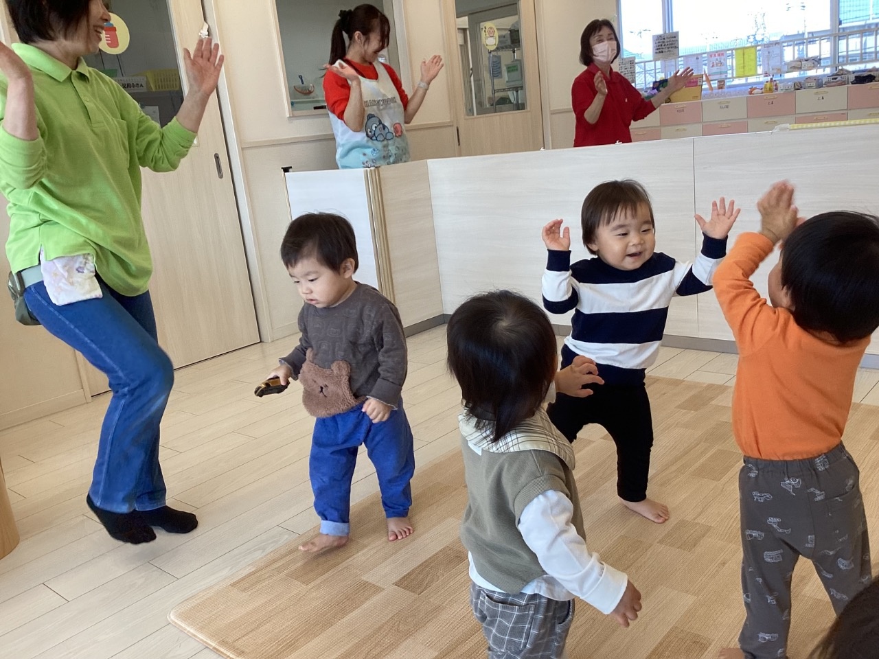 いないいないばぁや踊ることが好きなひよこ組さんは保育者や友だちと一緒に踊って楽しんでいます。