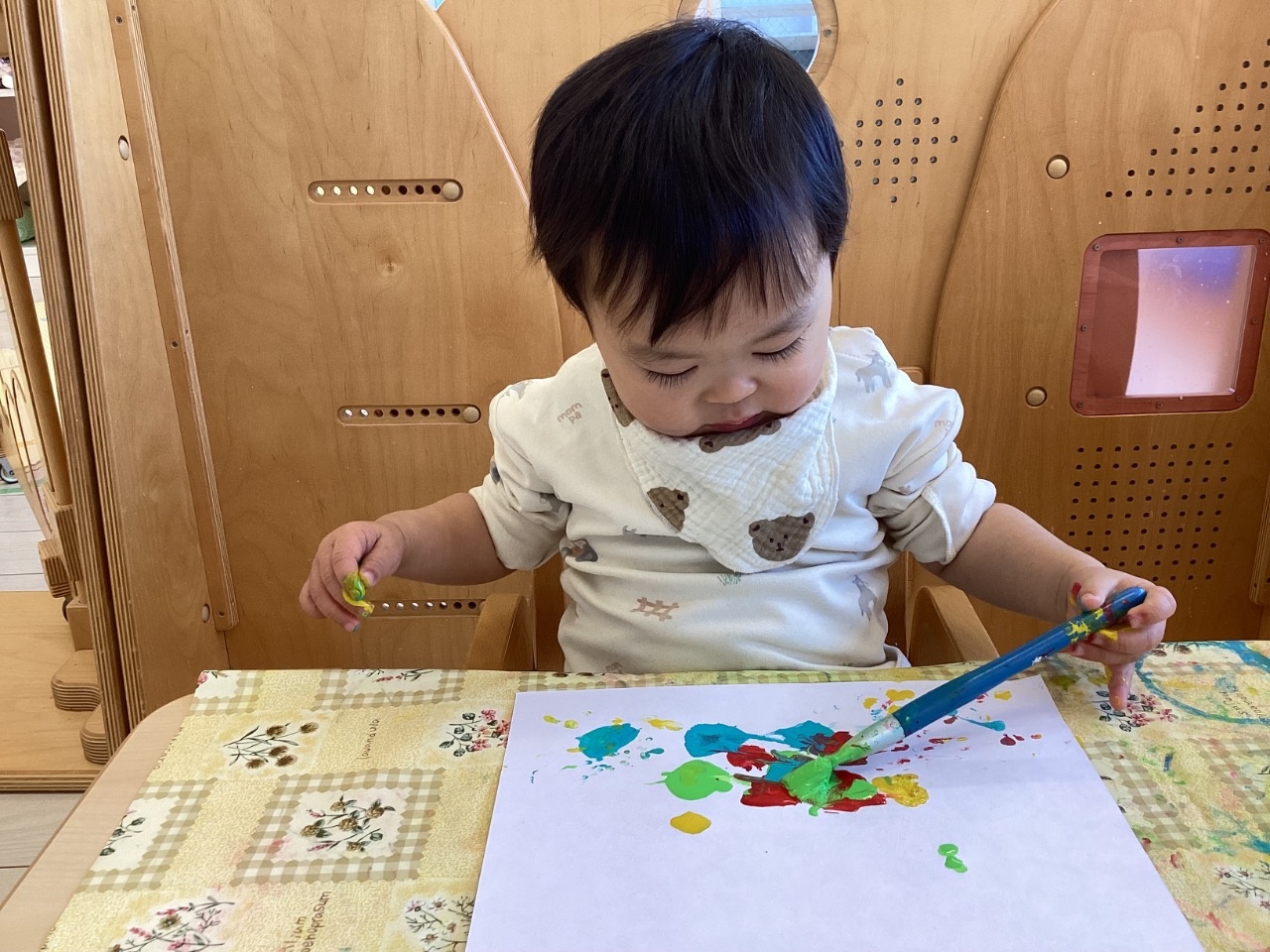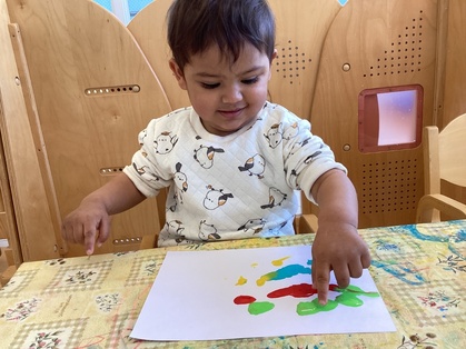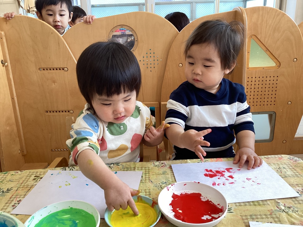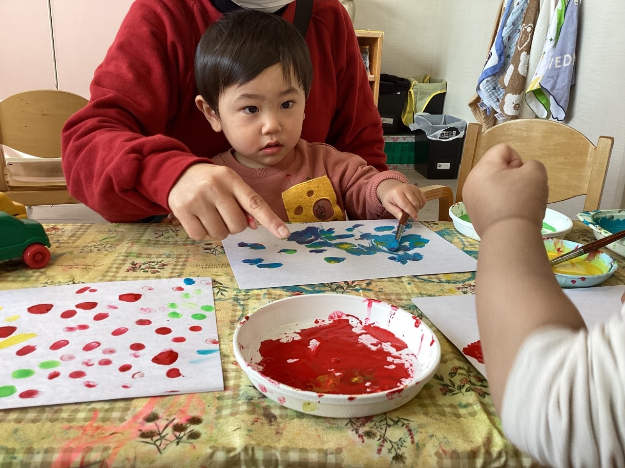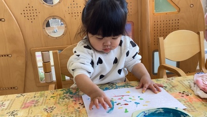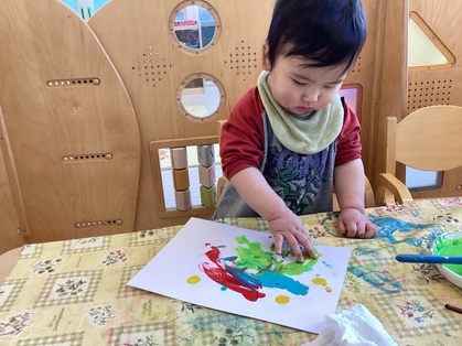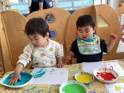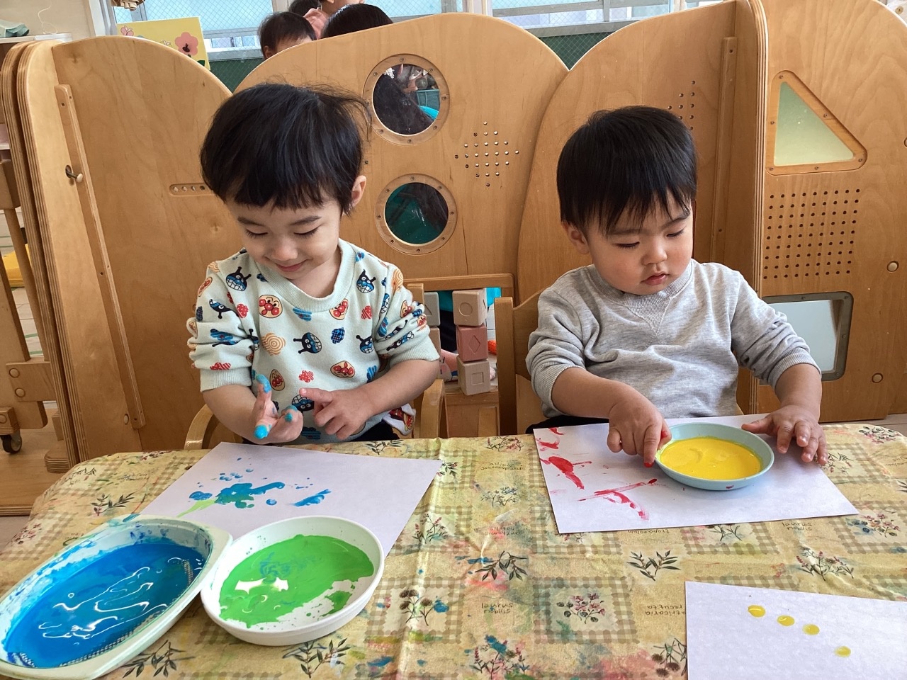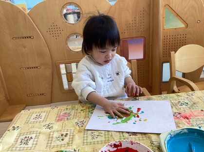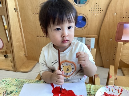 鬼の製作をしました。絵の具の準備を始めると、〝早くやりたいよ!〟とアピールしてくれます。手を使って思いっきり描く子、筆を使って描く子と自由に楽しめました。