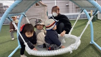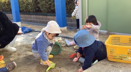 暖かい日は外に出て遊びました。外に出ると友だちの近くに行き、関わって遊ぶ姿が増えてきました。保育者は近くで子どもたちのやりとりを見守っています。