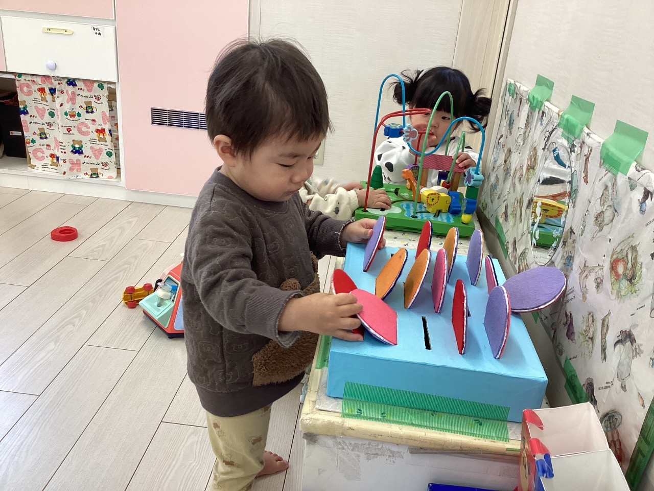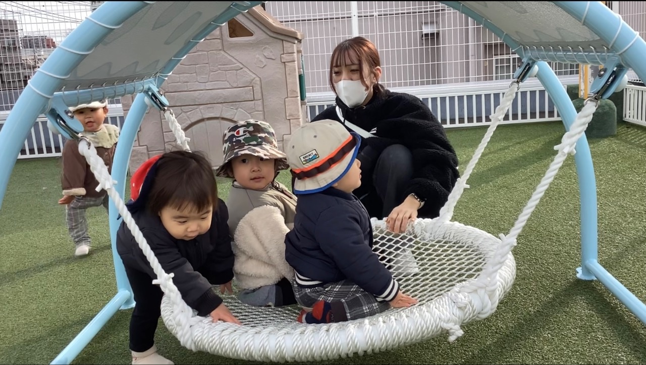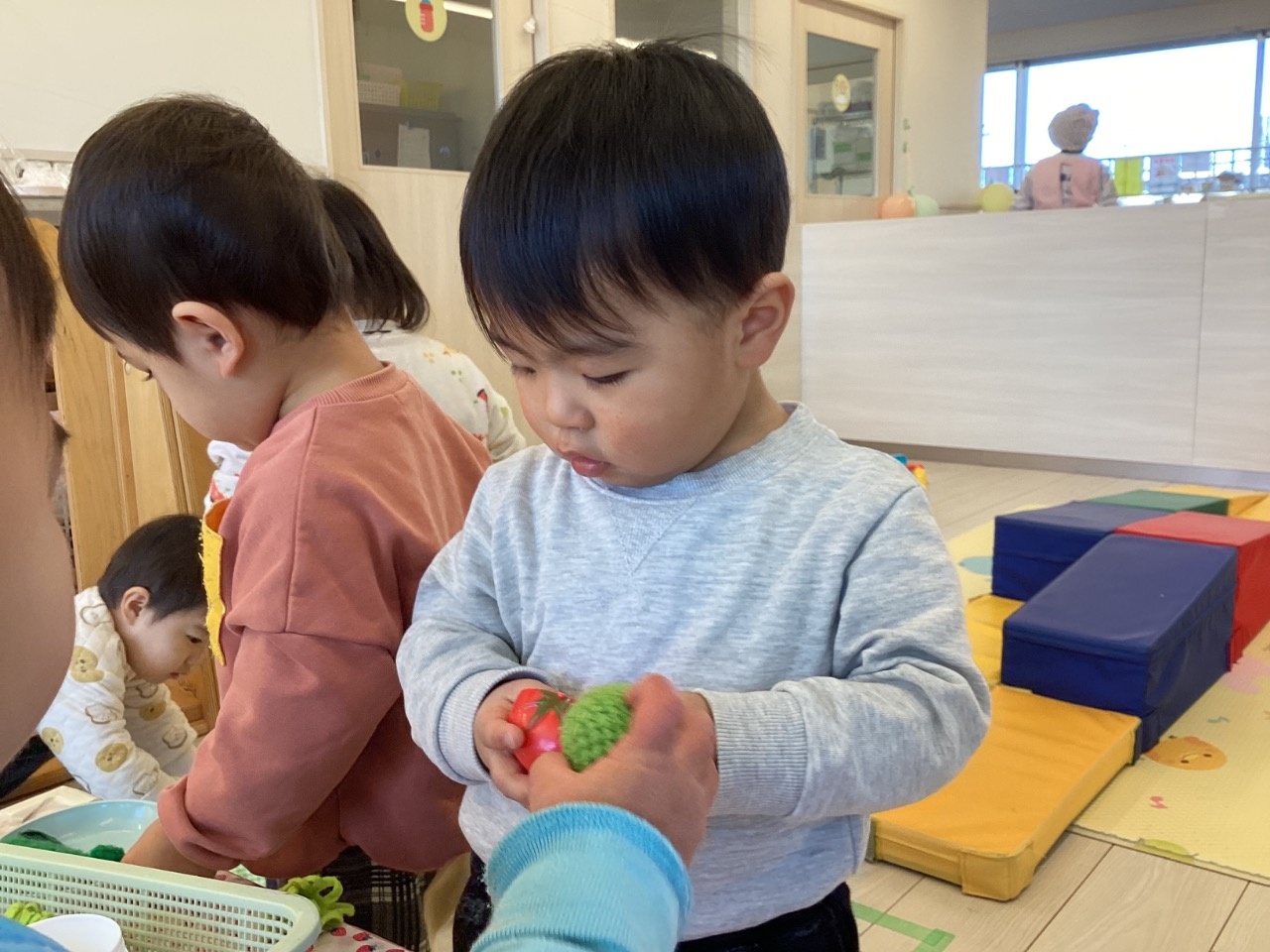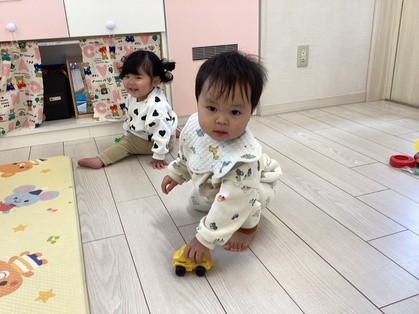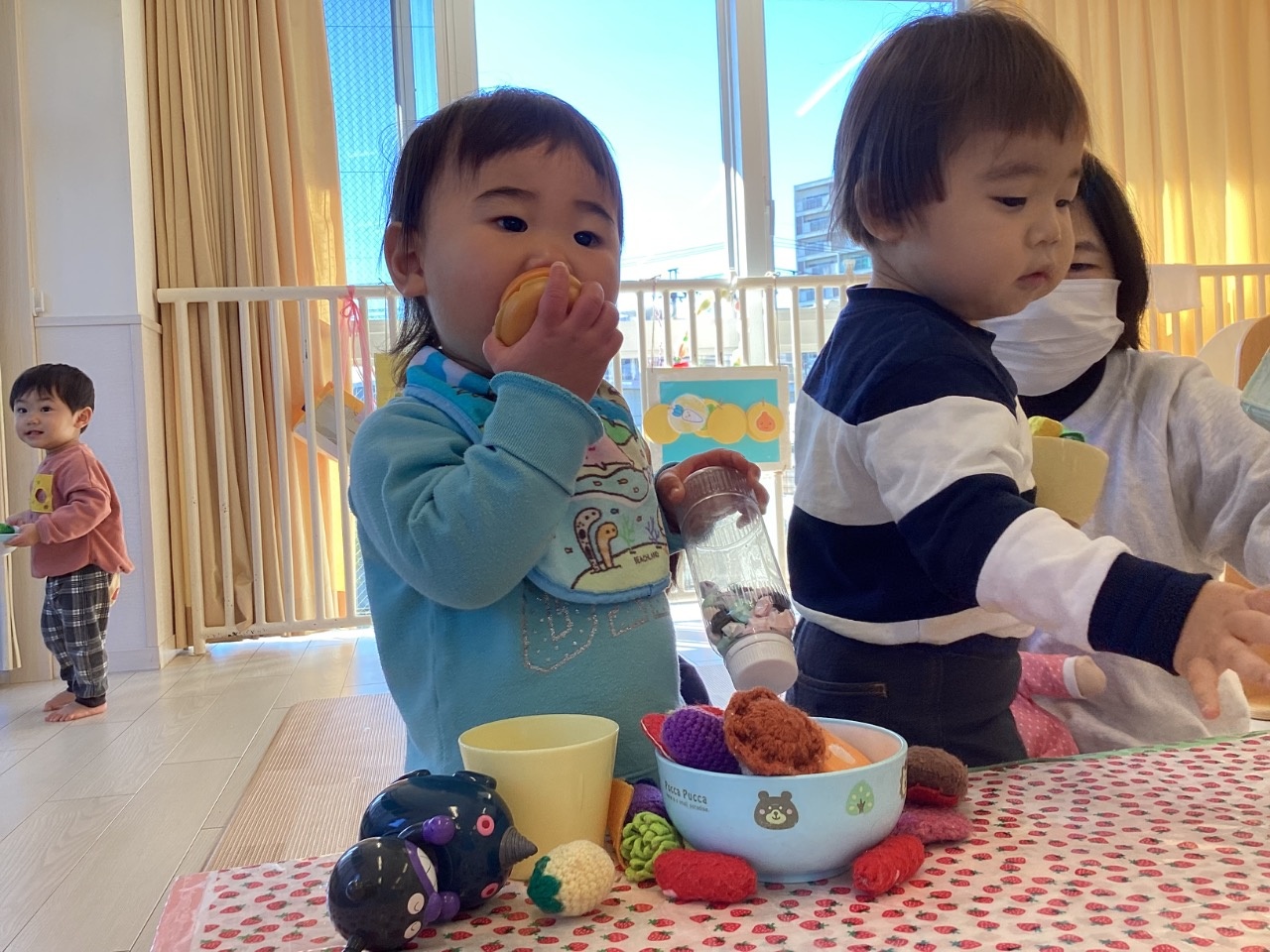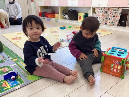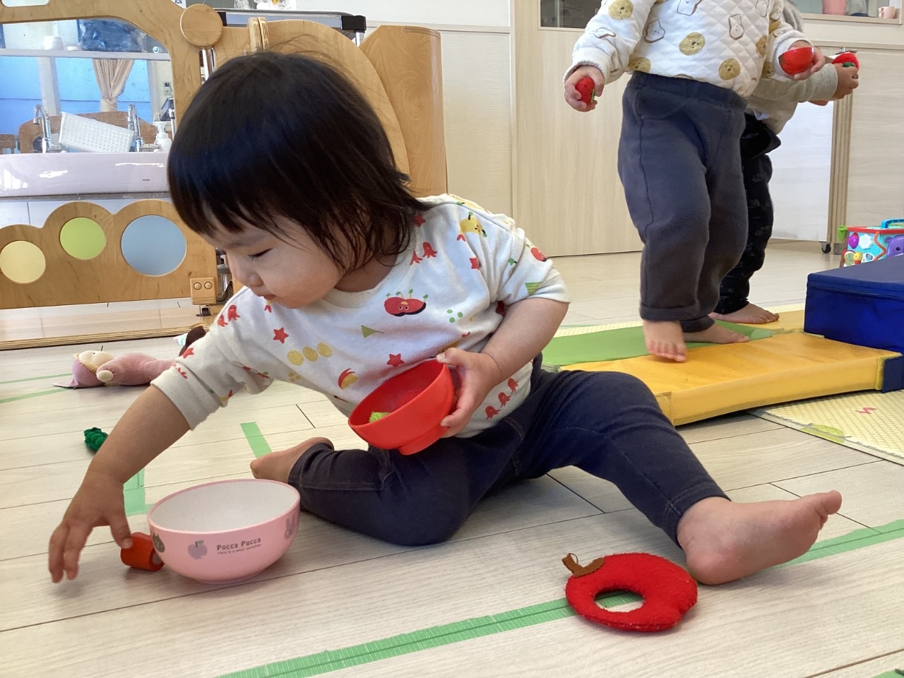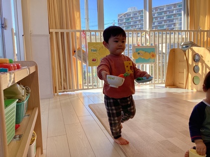 1月は部屋で楽しく過ごすことが多かったです。ちくわグループはままごとを増やすと、友だちや保育者とのやりとりが増えてきました。とまとグループはみんな歩けるようになり活動的になってきました。