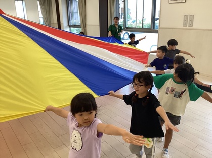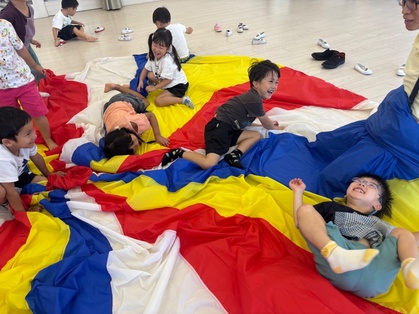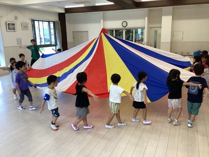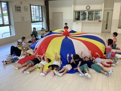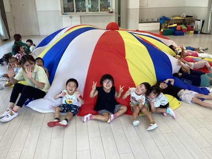 バルーンを見せると、「まえのきりんさんがやってたよね」「にじいろみたい!」「おおきいね」「はやくやりたい!」と言っていました。バルーンをトンネルみたいにくぐったり、布団に見立てて寝てみたりと、たくさん遊ぶうちにバルーンが大好きになりました。みんなで息を合わせて上から下に下げると大きなお山ができてとても嬉しそうでしたよ。