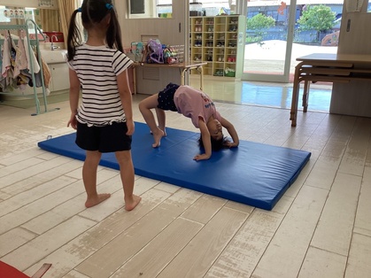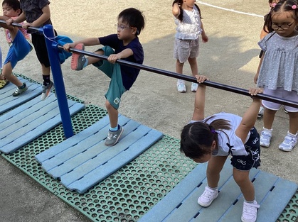 鉄棒で遊ぶことも好きで、手足を使ってぶら下がったり、足抜き回り、前回りなどにも挑戦しています。