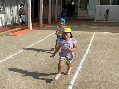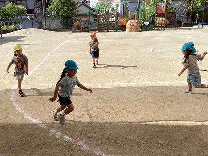 友だち同士でかけっこをしたり、ぞう組のお兄さんお姉さんと一緒にリレーを楽しんだりしています。