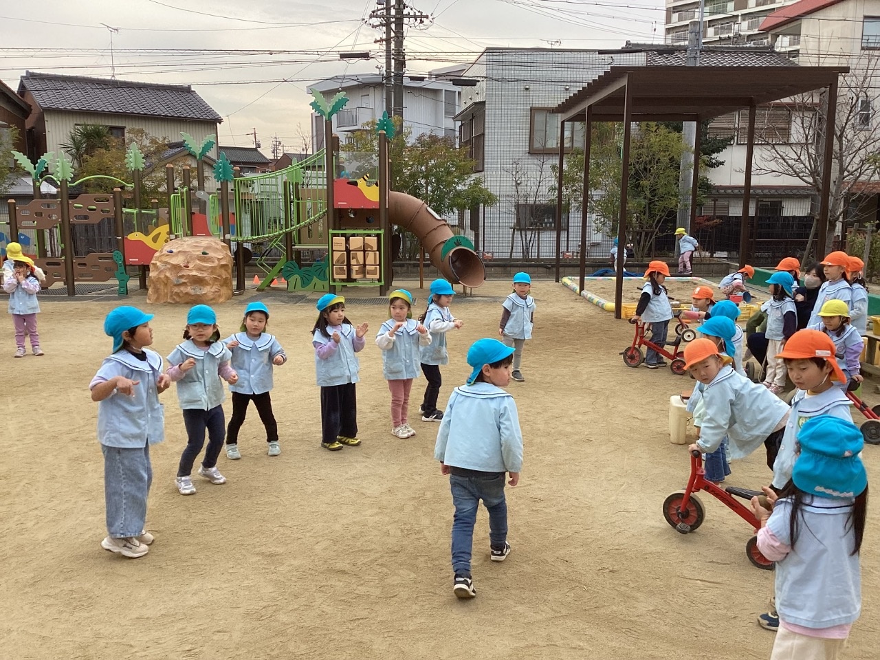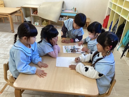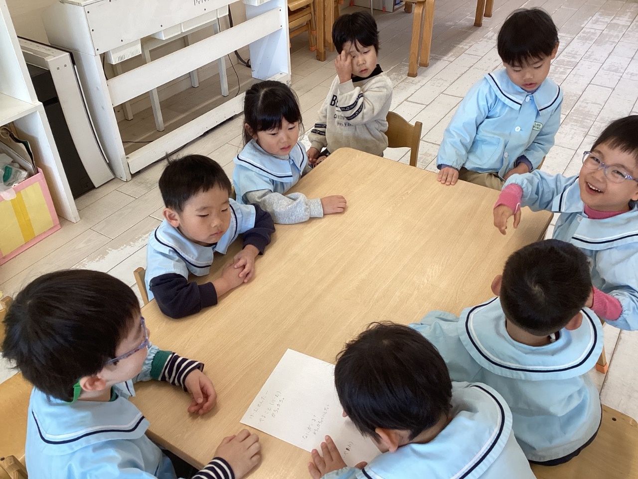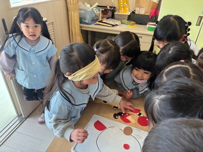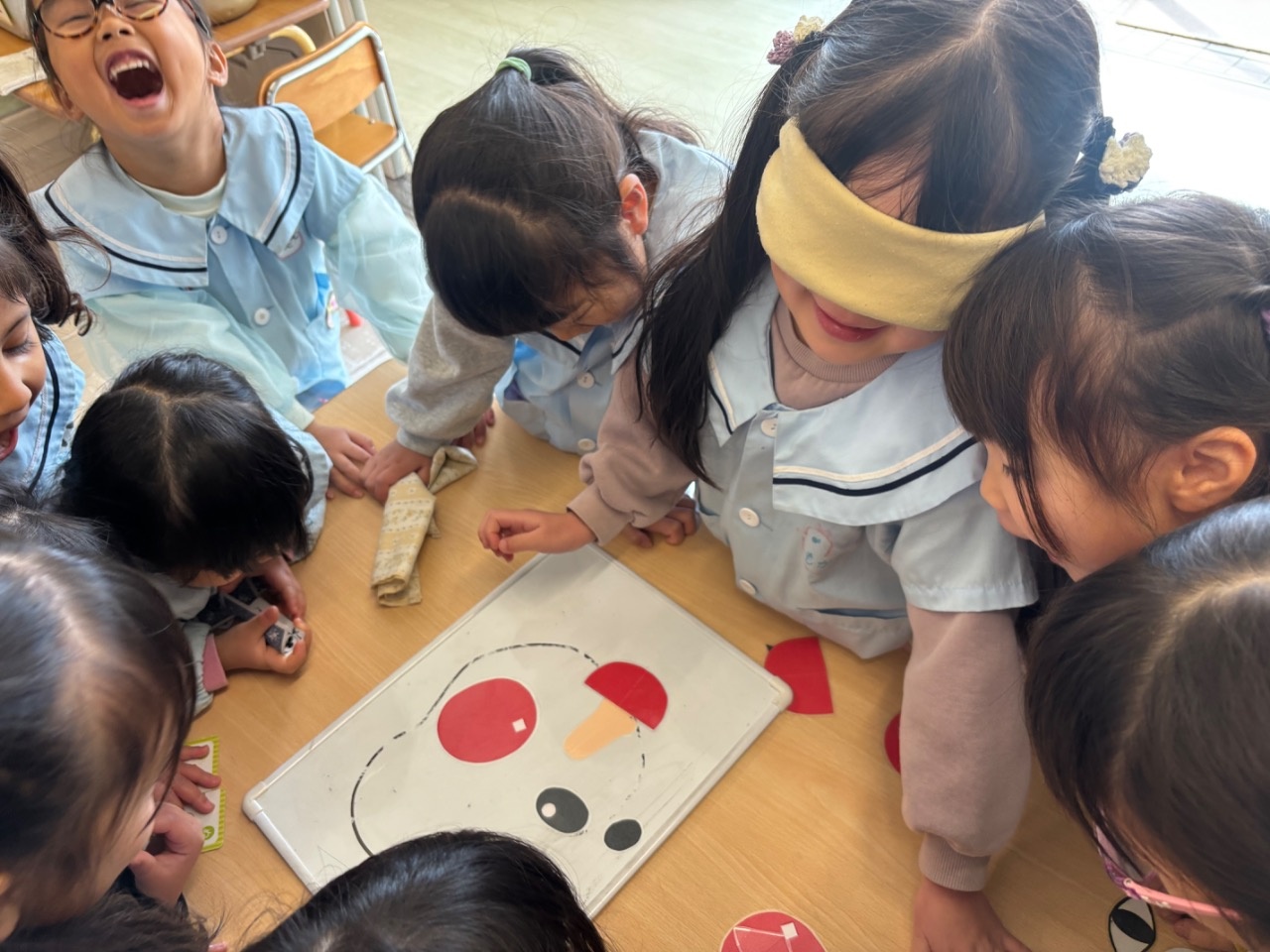 お正月遊びで、福笑いを楽しみました。最初は「うまく、かおにならない」と言っていた子どもたちですが、面白い顔になることが楽しくなってきて、大盛り上がりでした。
