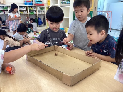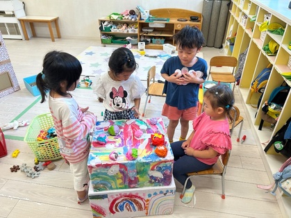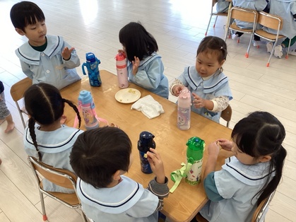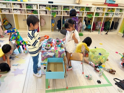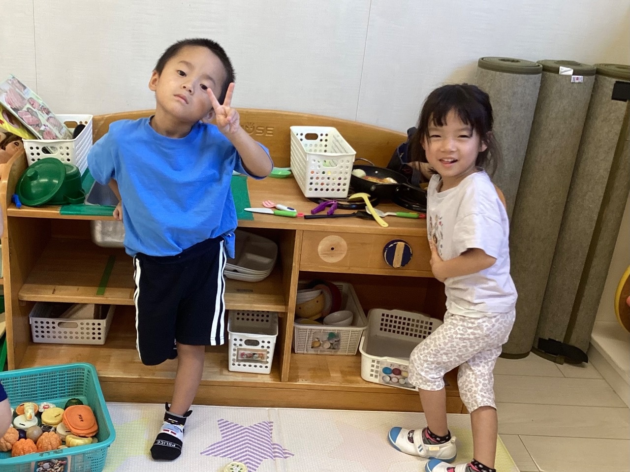 室内ではどんぐりコマやままごと、夏祭りで作った神輿をリメイクして作ったアイス屋さんなど、友だちと一緒に好きな遊びを楽しんでいる様子が見られます。アイス屋さんでは「みてみて!こんなに あいすかっちゃったから、あげるね!」と保育者や友だちにお裾分けする姿も見られて、優しい姿にほっこりします!