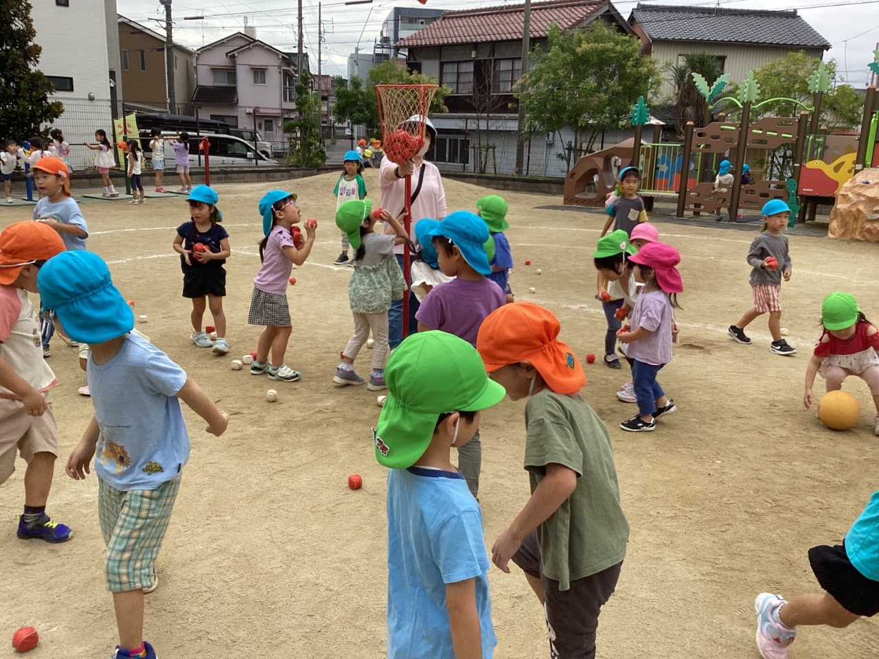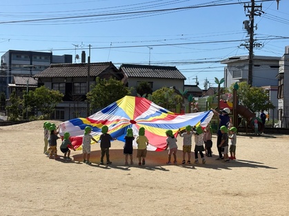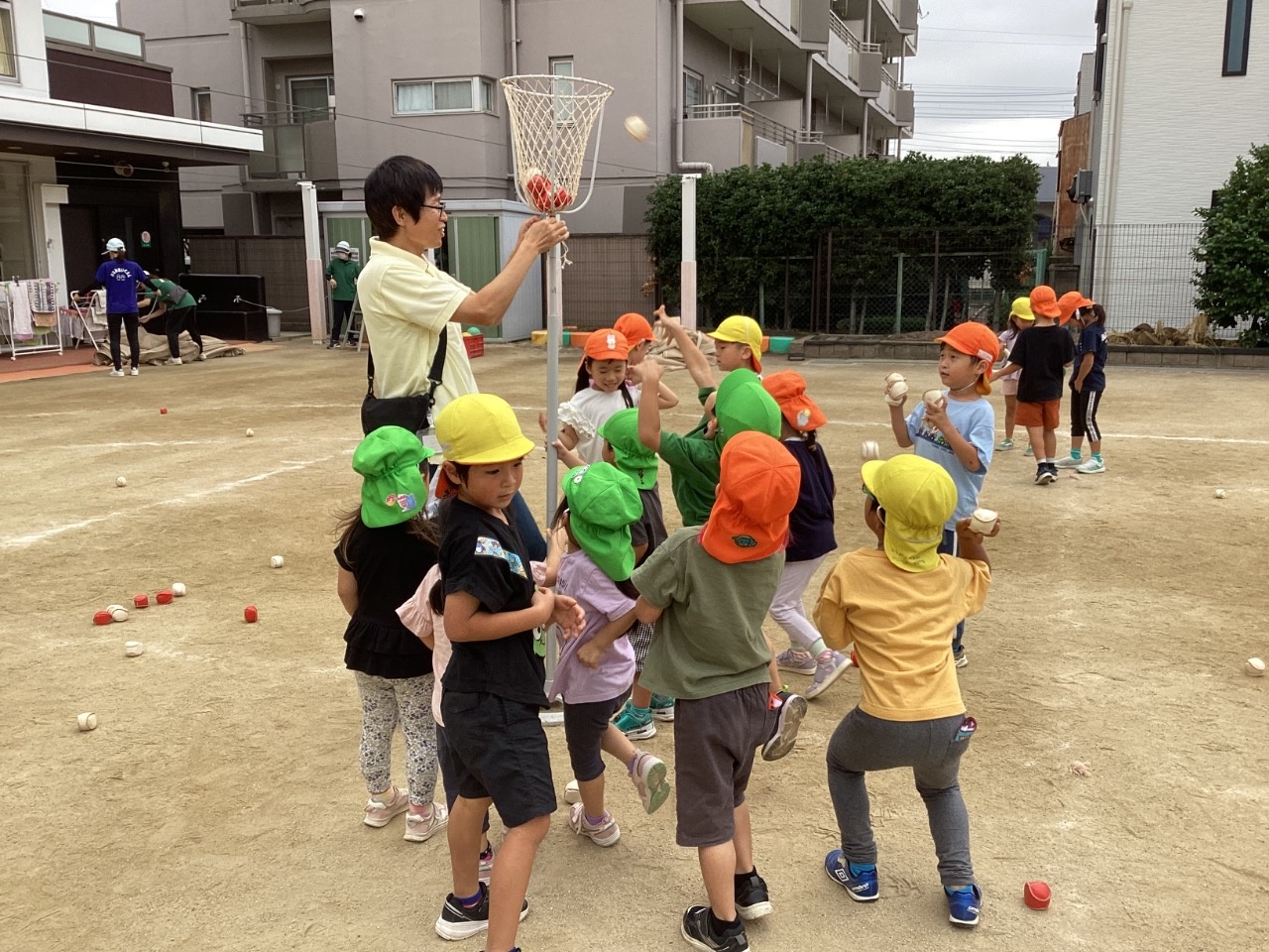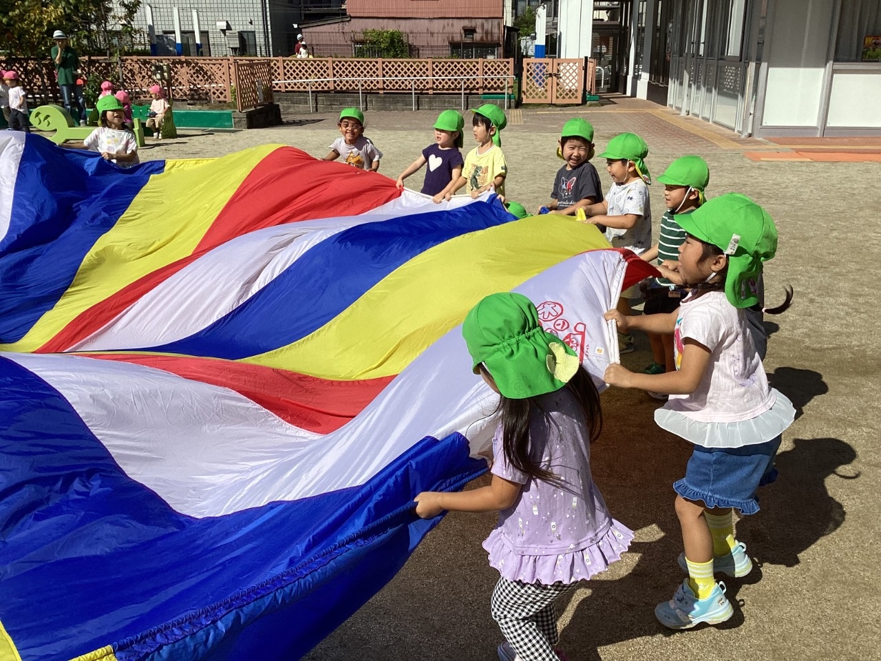 ダンスの他にも、保護者の方がやっていた玉入れや、きりん組さんが運動会でやっていたパラバルーンをやりました。