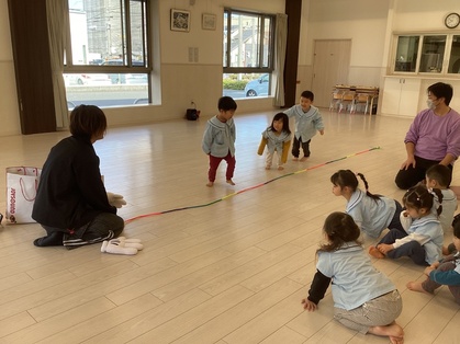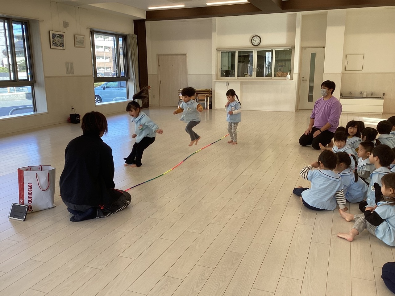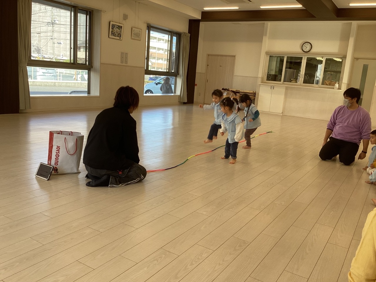 初回はヘビ縄跳びで遊びました。音楽をかけながら運動あそびをして、子どもたちも初めての活動にワクワクしながら参加できました。