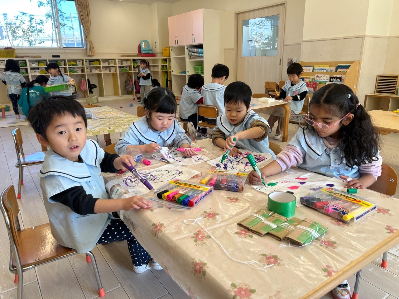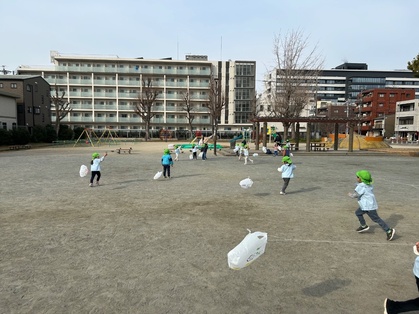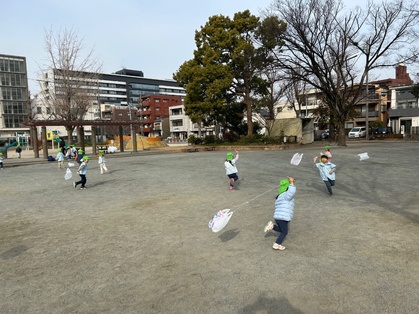 ビニール袋に絵を描いて、自分の凧が出来上がると「はやくとばしたい!」と待ちきれない様子で外に出てとても楽しそうに走っていました。