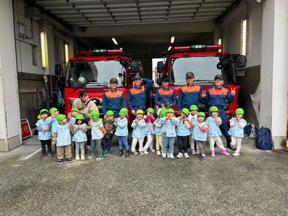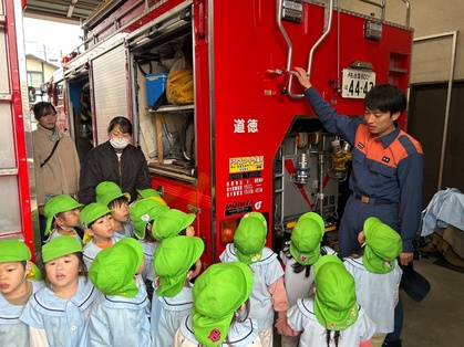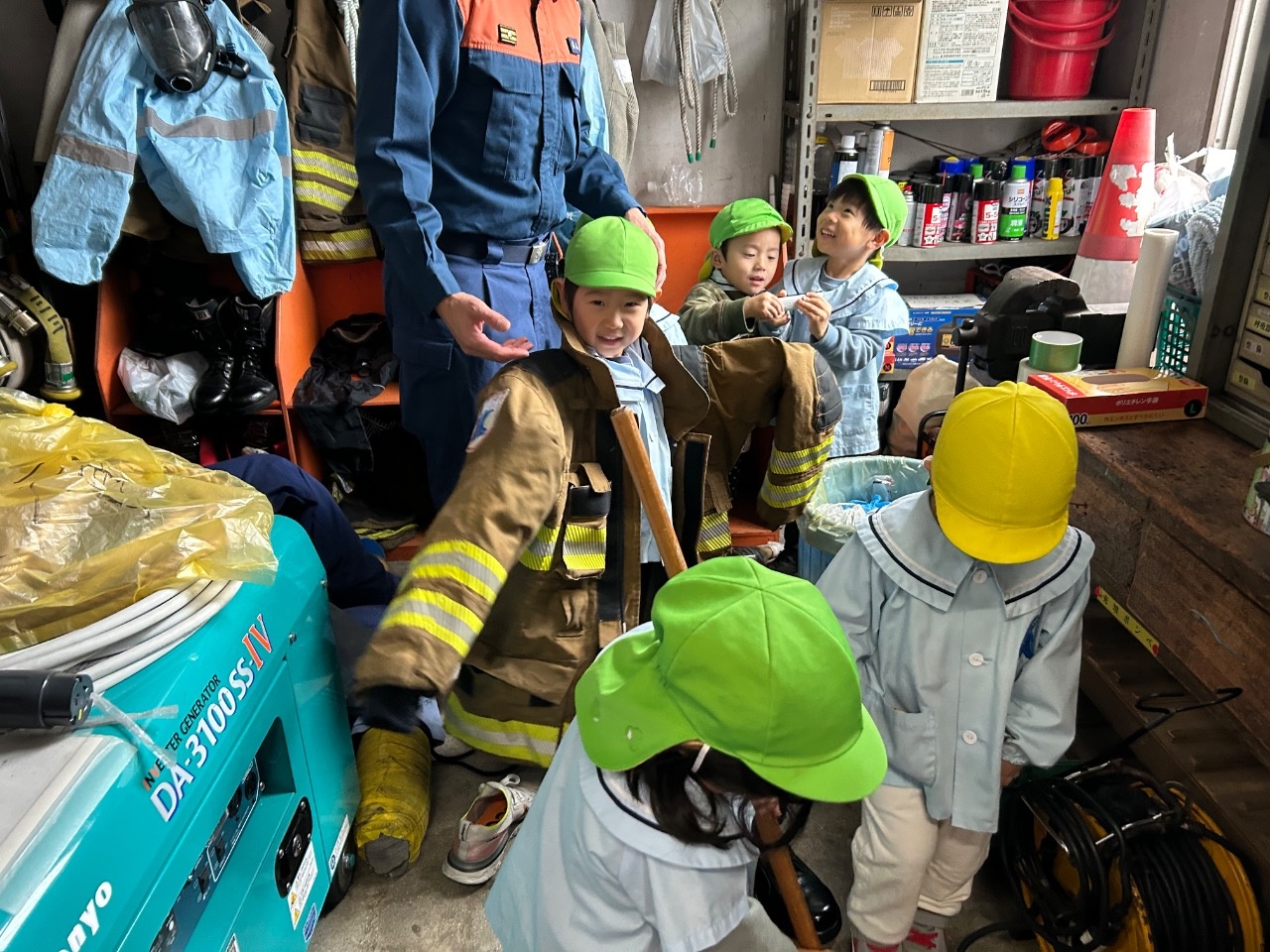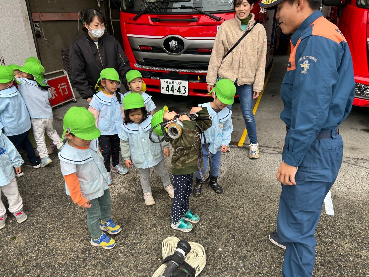 以前にも行った事があり、今回も消防士さんが出てきてくれて、消防車の中や装備品まで、沢山見せていただきました。「すごい!おおきいね!」「かっこいい!」「おもたい〜」と子どもたちは大喜びでした。