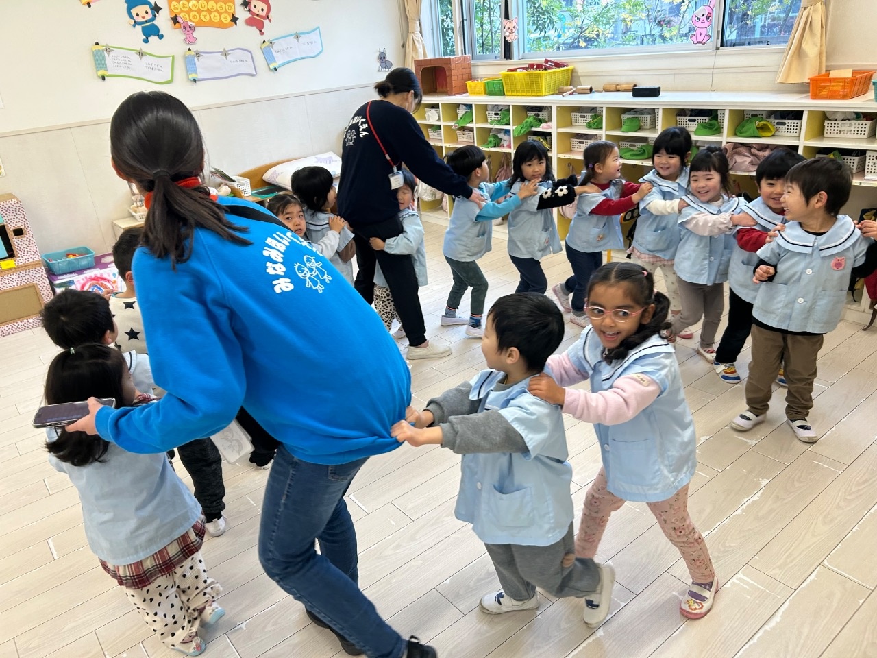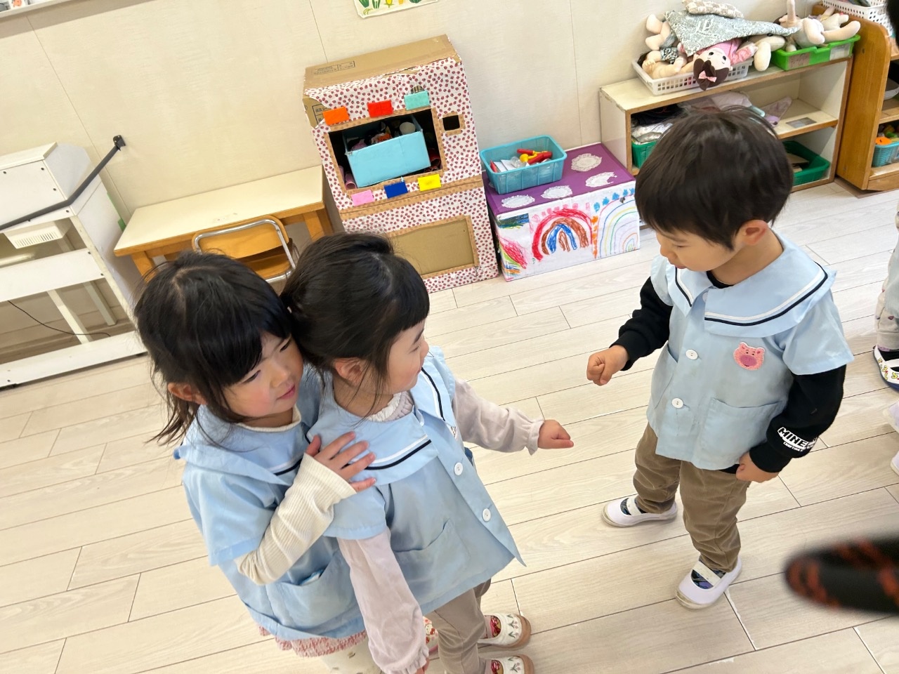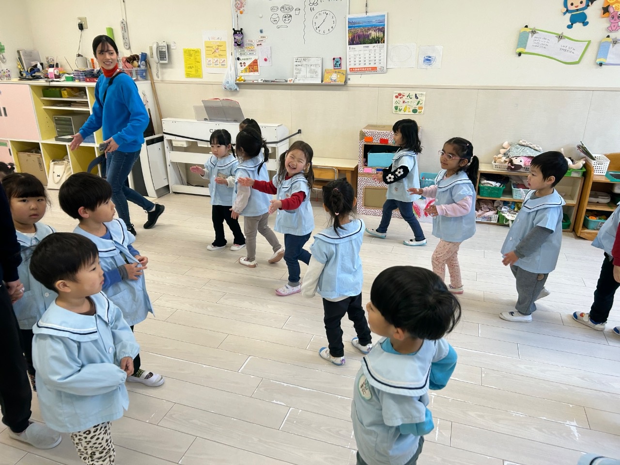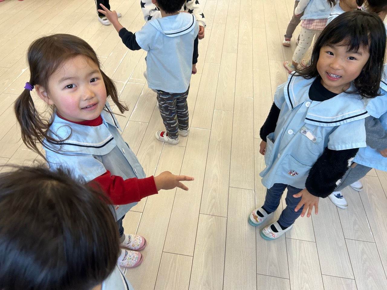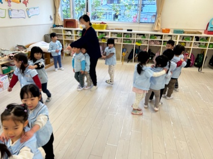 じゃんけんのルールが分かってきて、じゃんけん遊びができるようになってきました。みんなでじゃんけん列車をして遊ぶと、勝ち負けでトラブルになる事もなく、とても楽しそうに上手に遊び、成長を感じました。