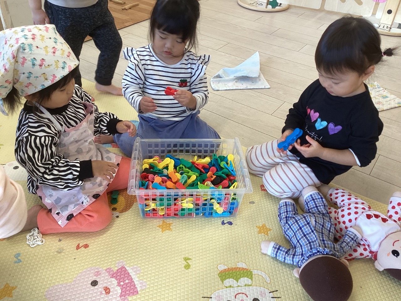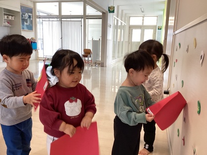 室内遊びでは、友だちと一緒に関わって遊ぶ姿も増えてきました。