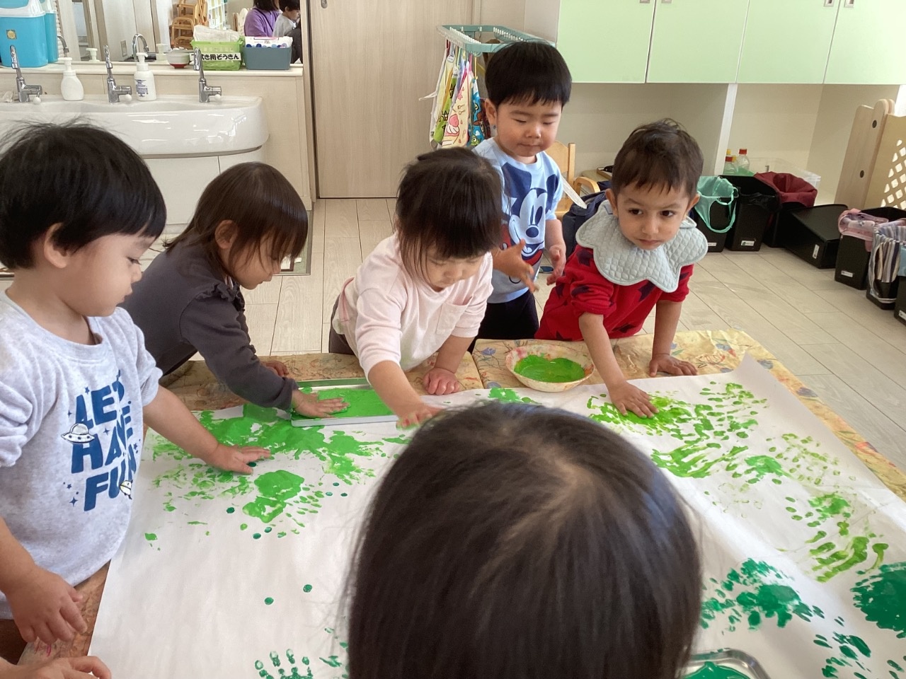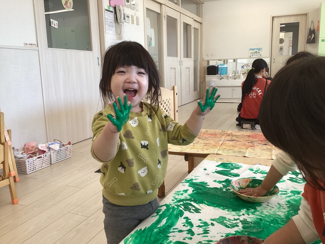手のひらいっぱいにつけて「ぺたぺた〜」と色を塗ったり、「わあ」と保育者に見せていたずら心も可愛らしいです。
