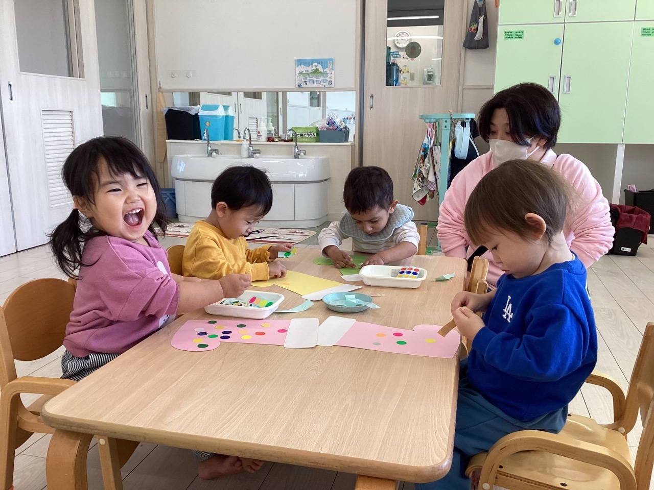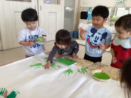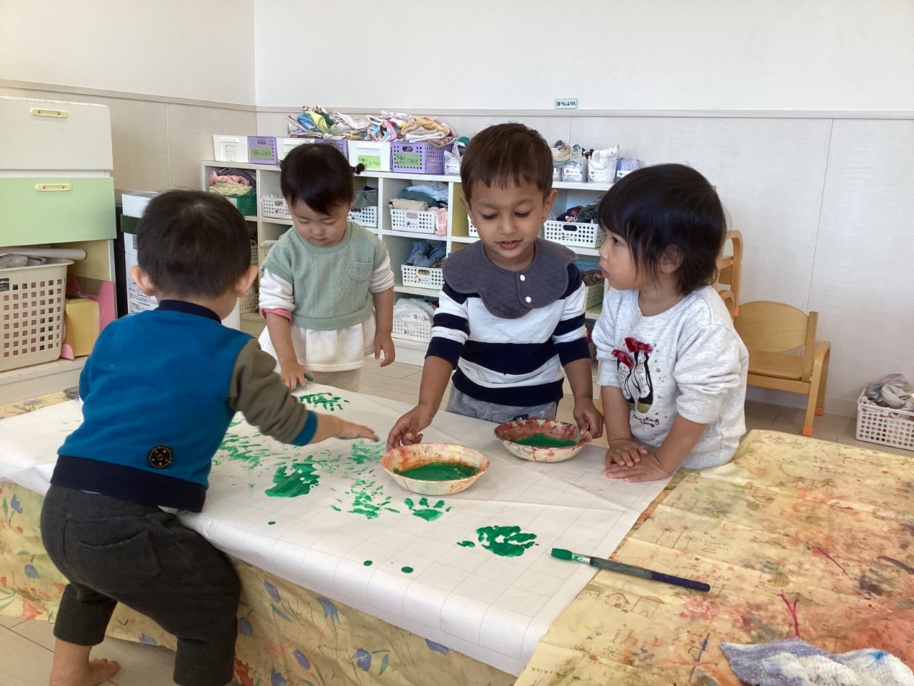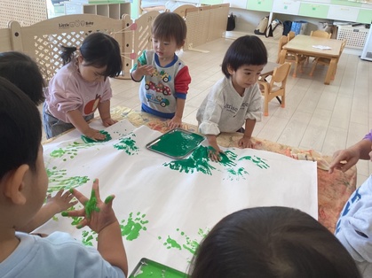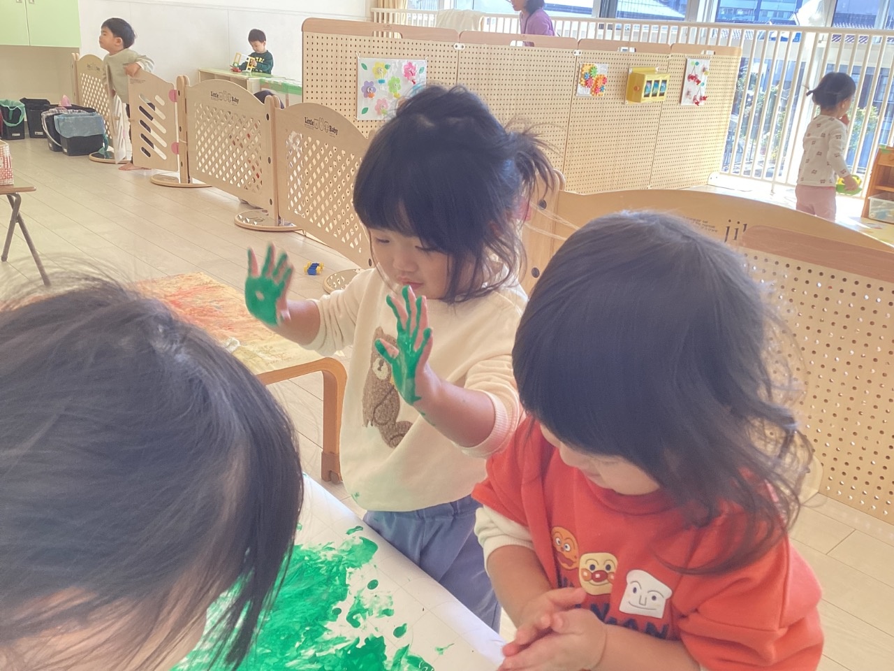手に絵の具が付くと「つめたいねぇ」と話しながら絵の具を付けて大きな紙にペタペタ塗りました。