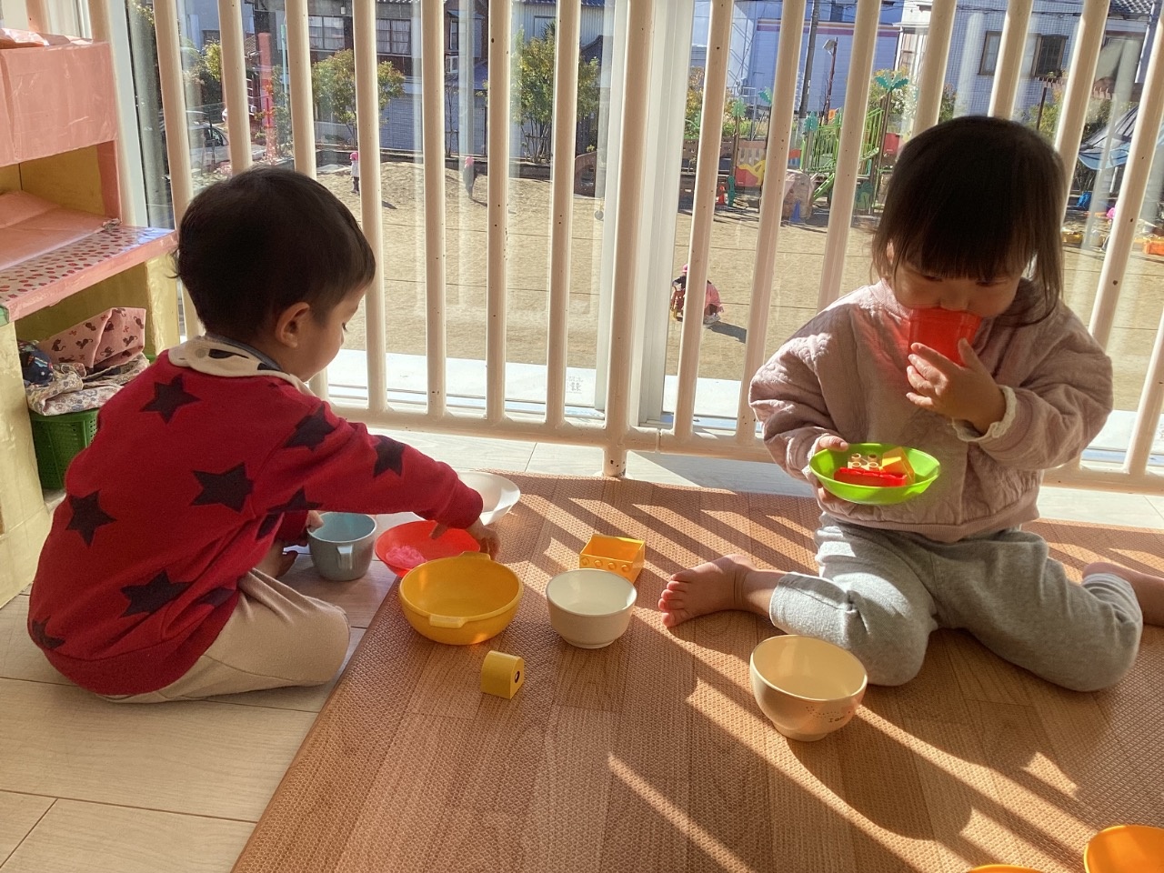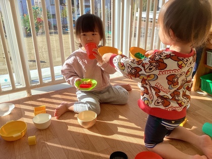 ままごとで作ったご飯を「どうぞ」と渡してくれる子もいますよ。