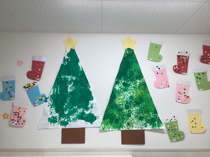 保育園にクリスマスツリーが飾られ、「きれいね」と見入っています。今月は興味の出てきたツリーやブーツを作りました。