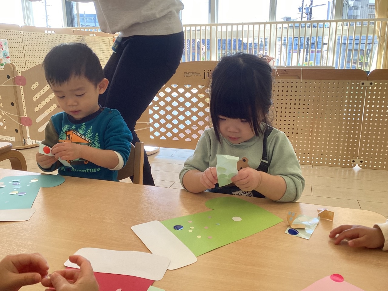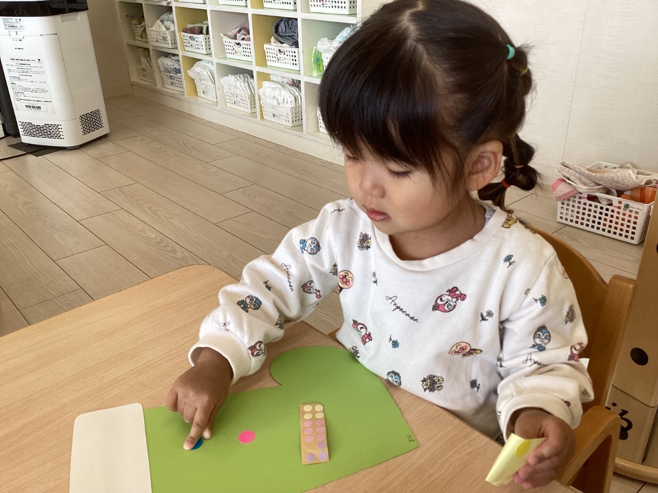 シール貼りでは、台紙から剥がして「ぺたぺた」と言って貼っています。
