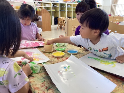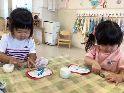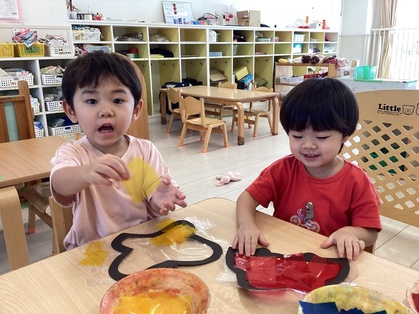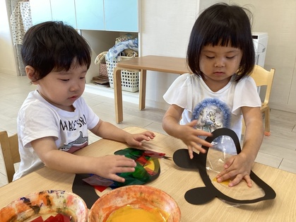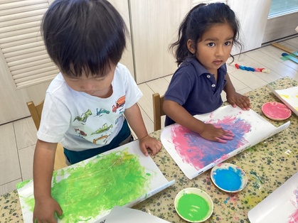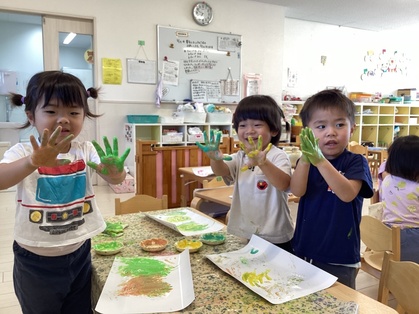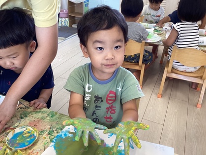 手にいっぱいの絵の具をつけて紙にいろんな色をつけてみたり、「みてみて」と言って手のひらを見せあったりしてニコニコで楽しんでいました。「〇〇いろになった!」と嬉しそうに色の変化も教えてくれましたよ!