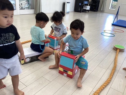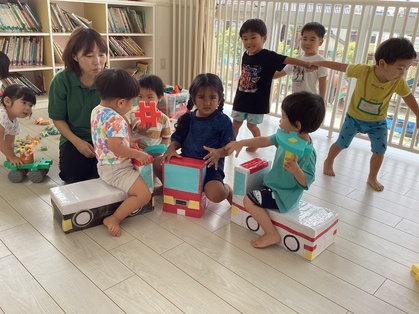 運動会に向けて救急車や消防車などの働く車のコンビカーやシンキングを用意すると楽しそうに友だちと乗って、並走したりして楽しく遊んでいます。