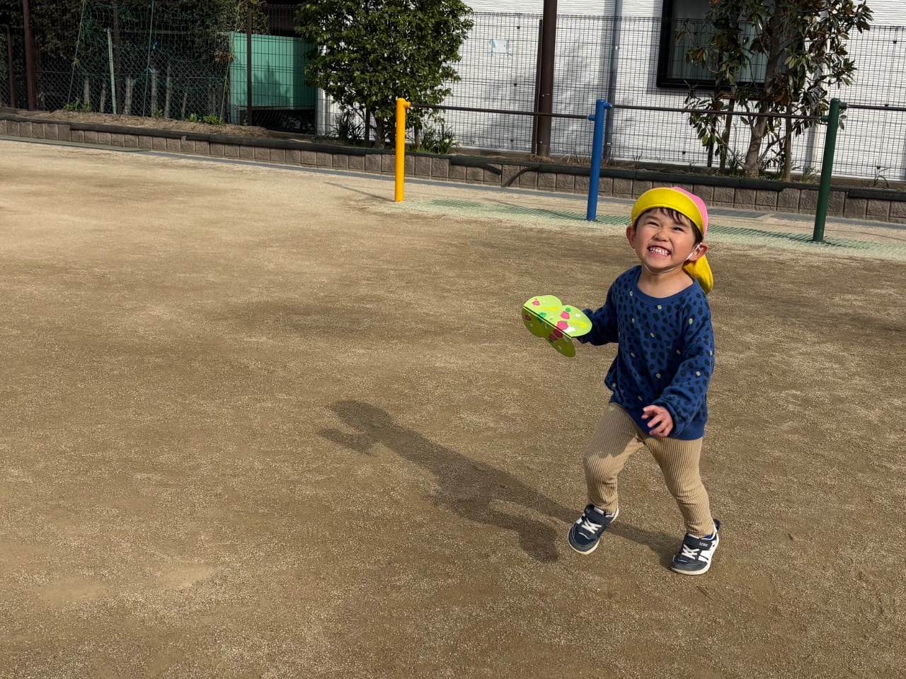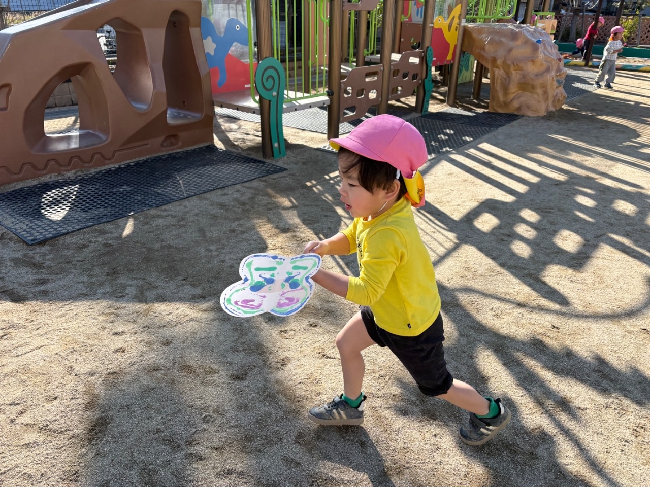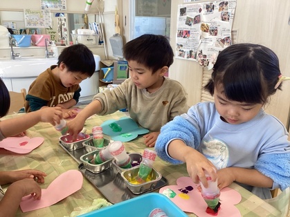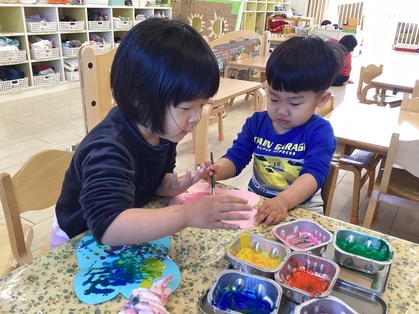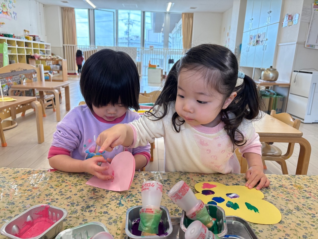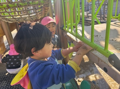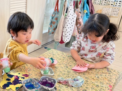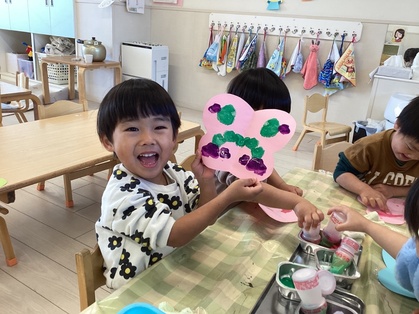 パタパタちょうちょの製作では、画用紙同士を合わせて同じ模様ができる不思議さを味わっていましたよ。「もっとつくりたい」と色々な柄のちょうちょを作っていました。作ったちょうちょを持って戸外に行くと、「ちょうちょとんでる」「ここにとまってる」と嬉しそうな表情を浮かべていました。