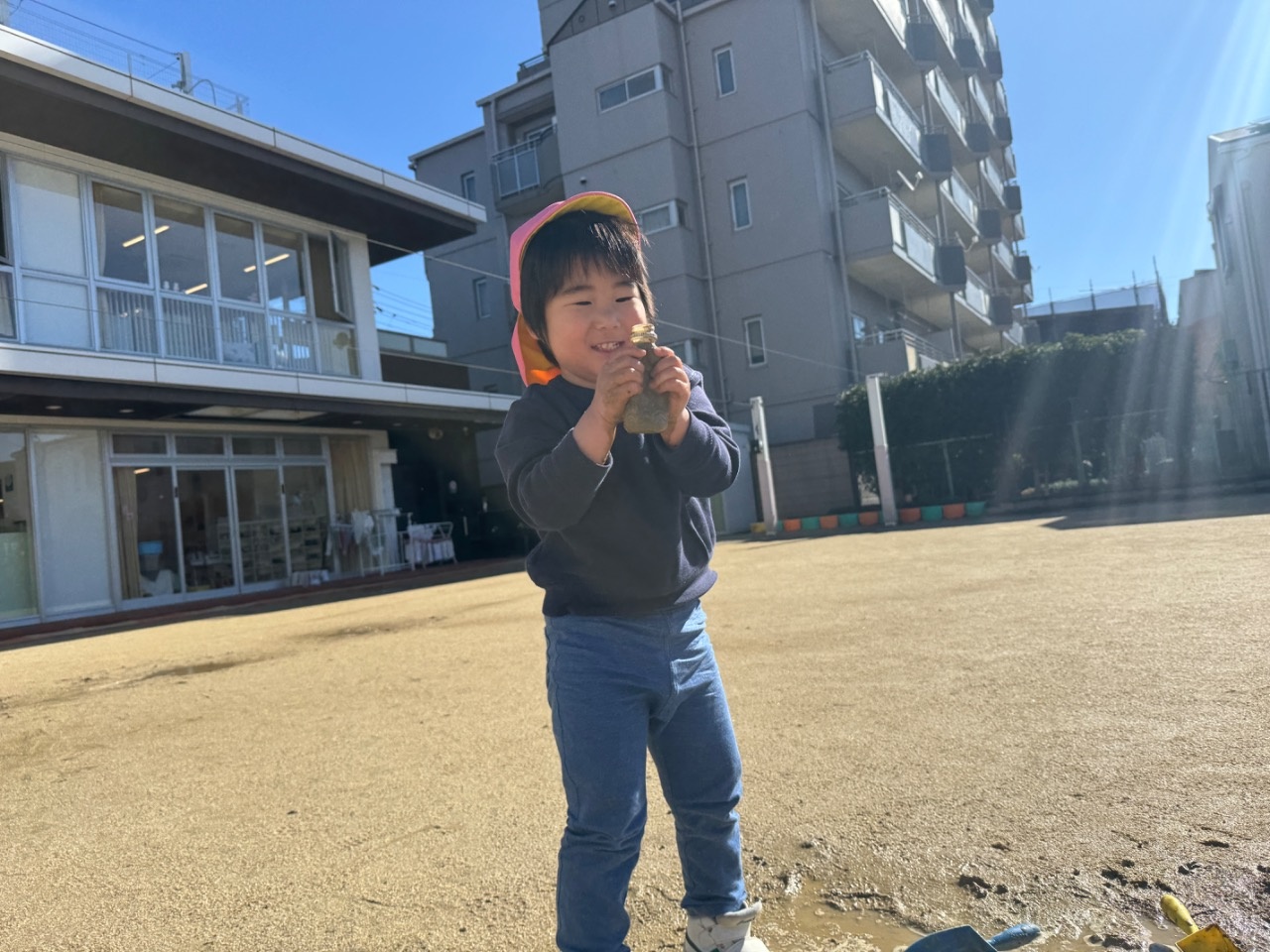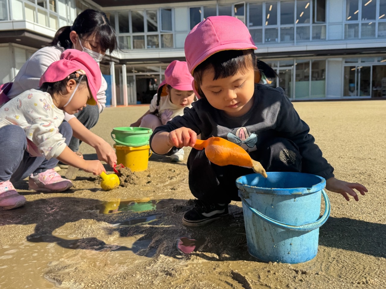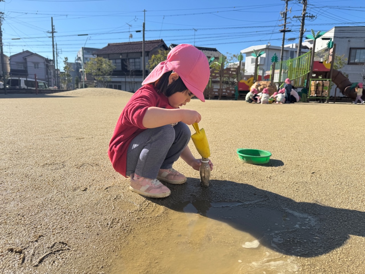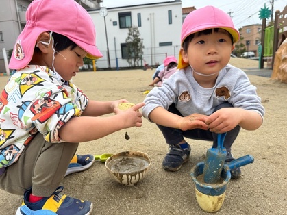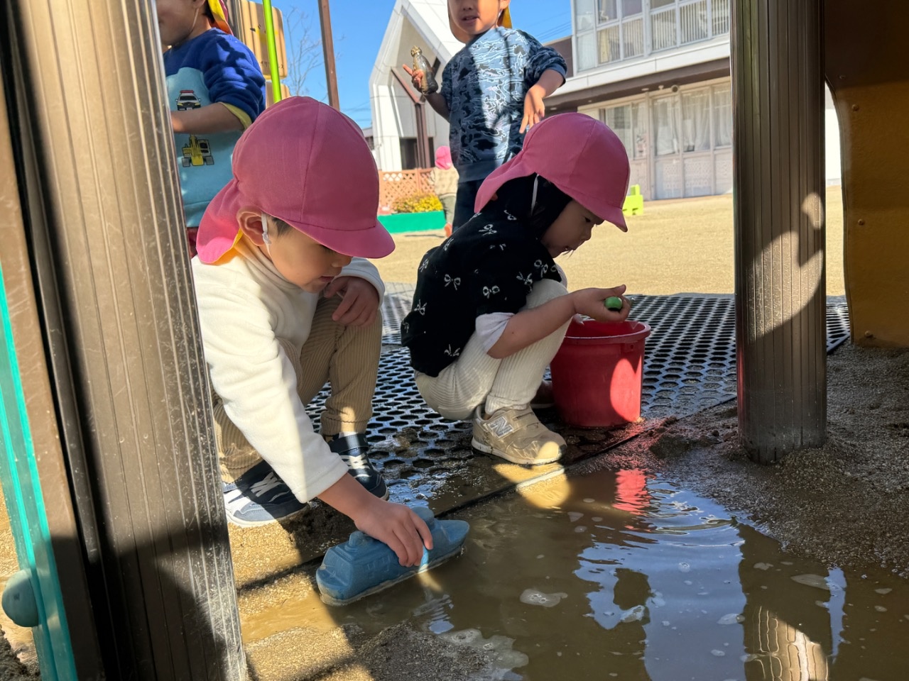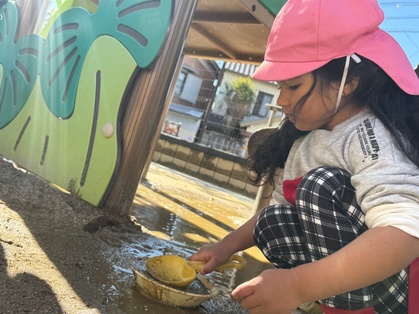 雨が降った次の日に、園庭に行くと水たまりを見つけた子どもたち。スコップやバケツなどの玩具を持ってきて、「ちょこけーきつくってる」や「ふねおよいでる」などの会話を楽しみながら遊んでいましたよ。もう一度、水たまりができないかなと楽しみにする姿が見られました。