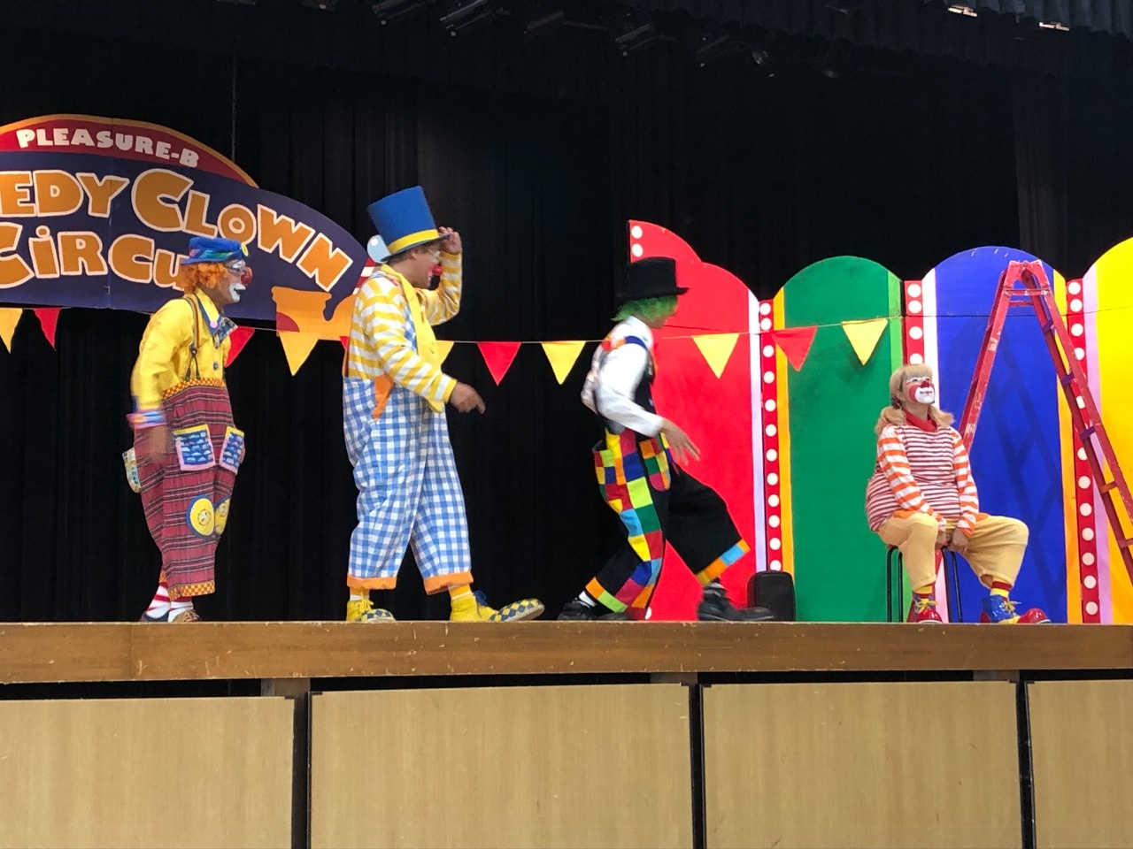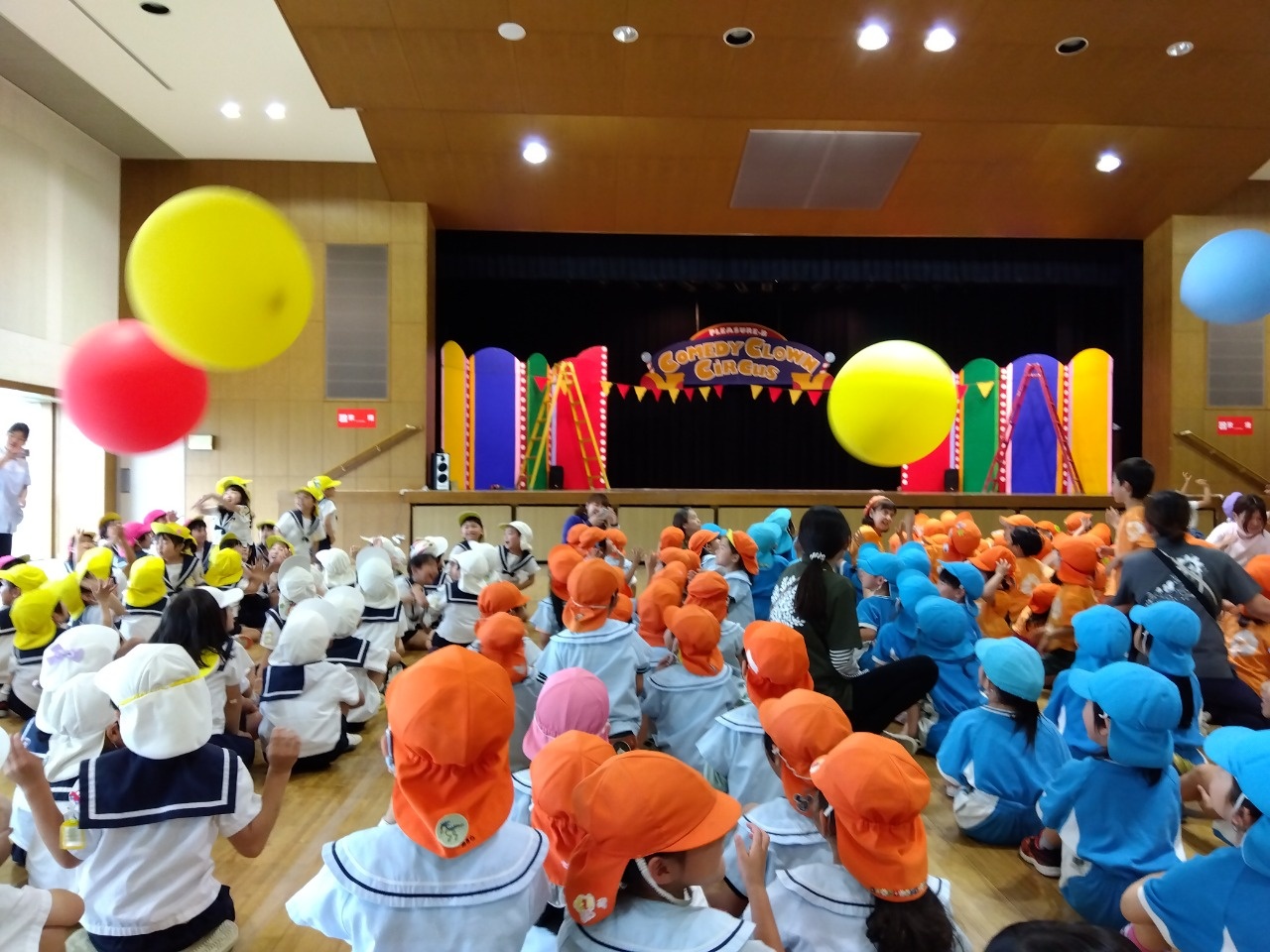 年長まつりに行ってきました! 南区役所で行われた年長まつりに参加しました。「ミオーちゃんいるかな?」「ピエロがくるんでしょ?」と朝からワクワクがとまりませんでした♪ 最初にミオーちゃんと一緒にミオーダンスを踊りました。園でも楽しんでいる踊りなので、ミオーちゃんと踊れて嬉しそうでした。 クラウンさんのショーでは輪っかを首に入れる技や、おでこにカラーコーンをのせる技などを見て「えーっ!!」と驚きと楽しさで大盛り上がりでした。大きい風船が飛んでくる場面もあり、みんなで触って楽しむことも出来ました。