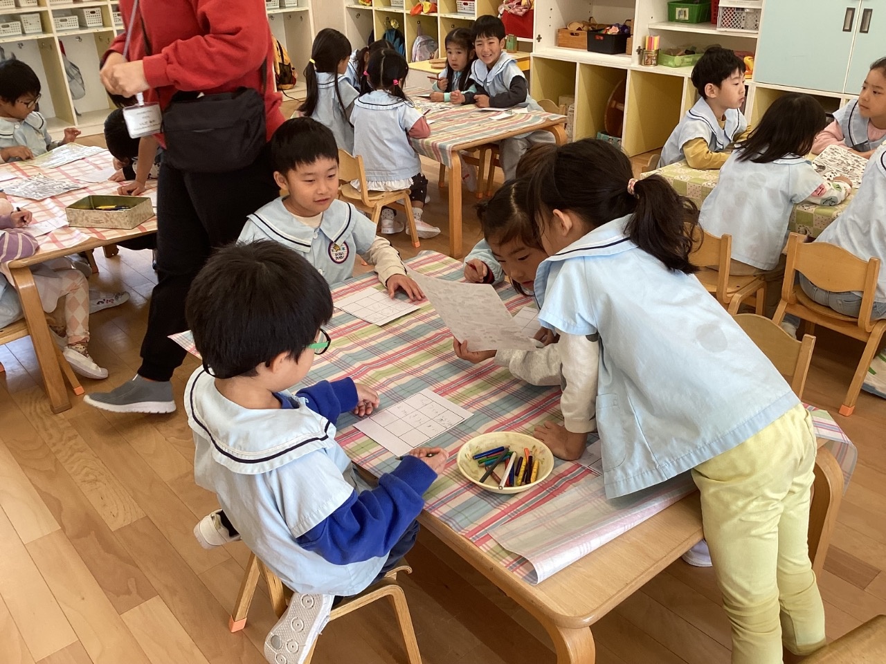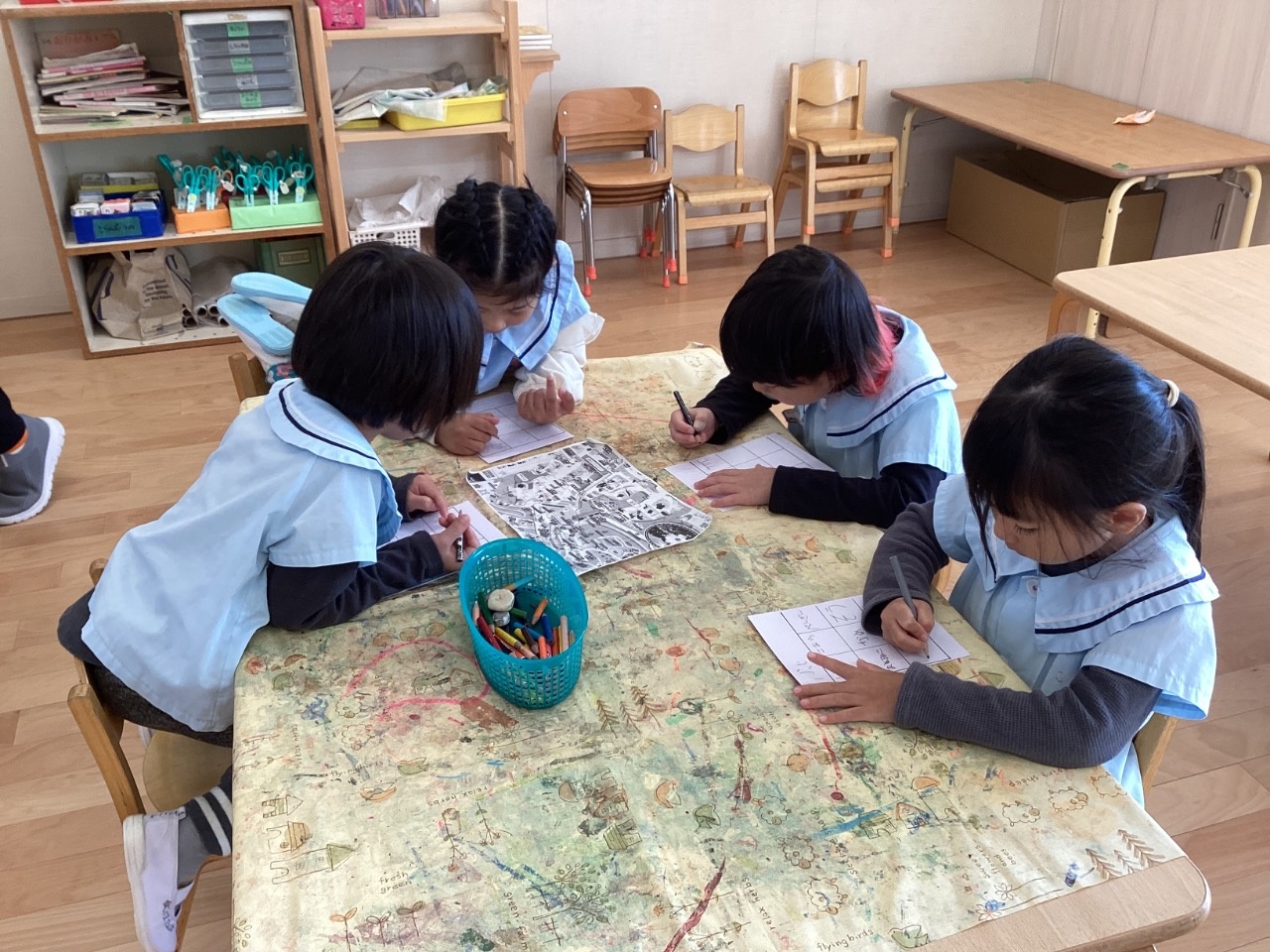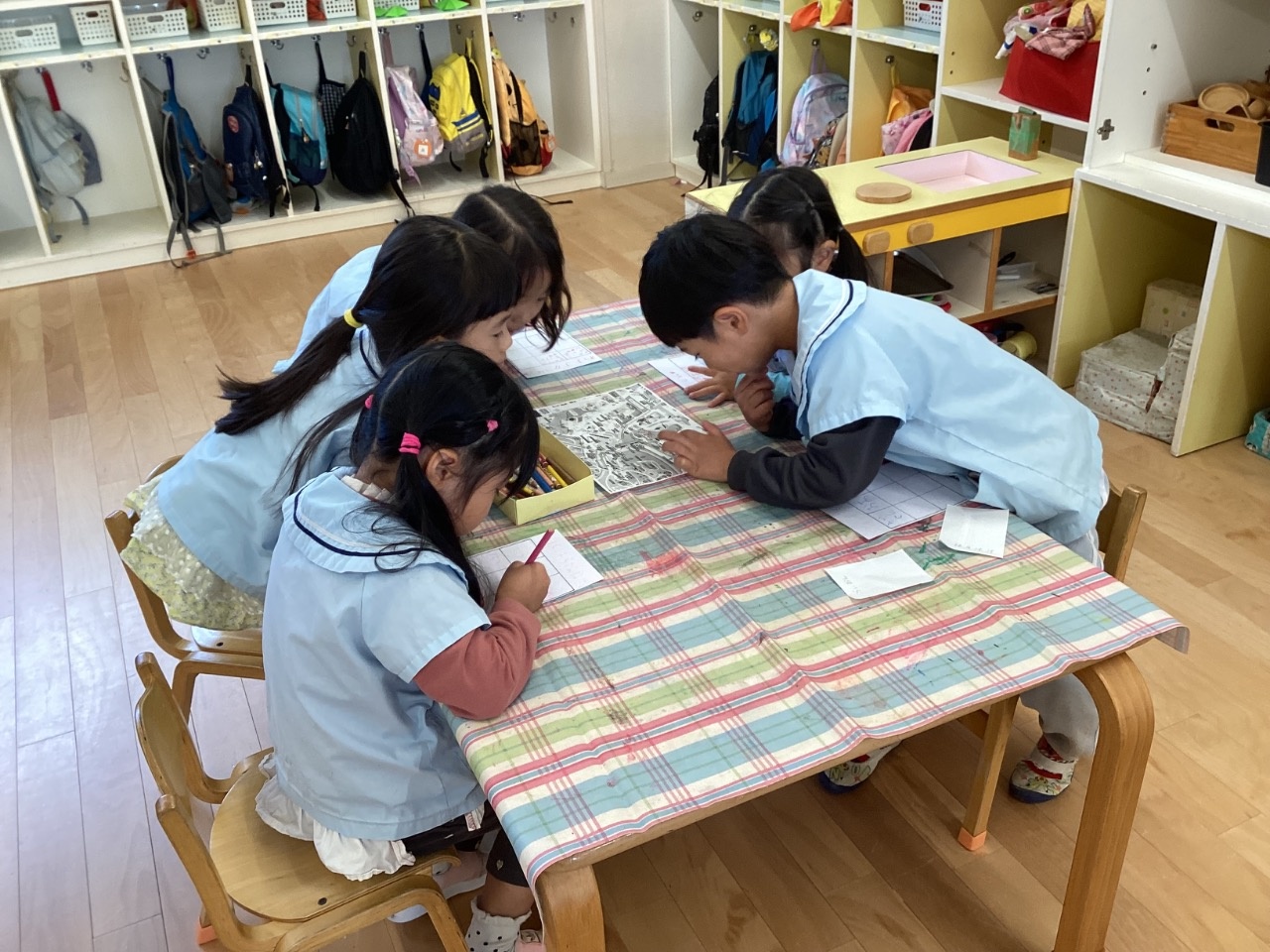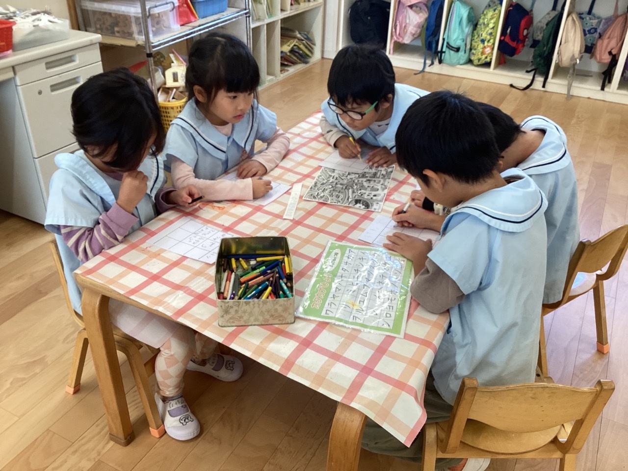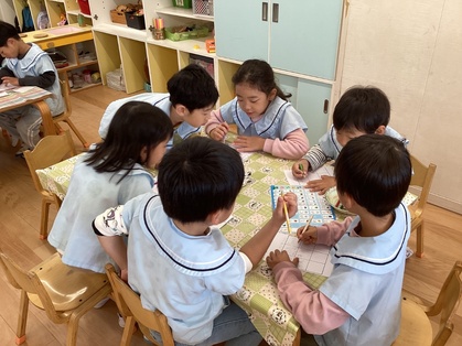 遠足のあとみんなでビンゴゲームをしました。ひらがな表や動物園の地図を見ながら、「コモドかっこよかったよね」「ね、ってどうやってかくんだっけ?」と楽しかった思い出を話したり文字を教え合う姿がありました。わからない時には保育者に見本を書いてもらい、写してみるなど、みんな諦めることなく全てのマスを自分で埋めていく姿にとても成長を感じました。