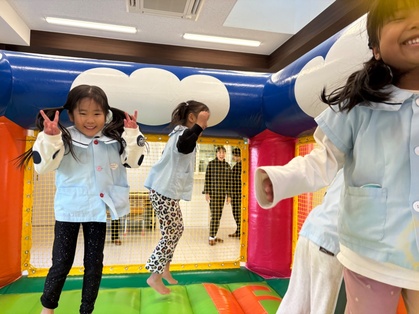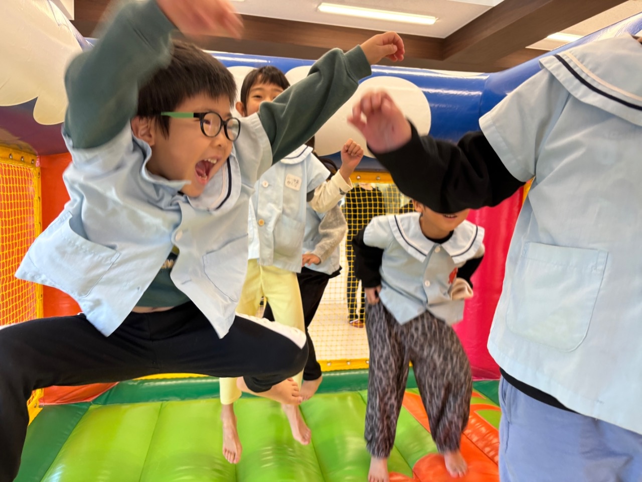 遊具メーカーのジャクエツさんがエアートランポリンの体験会がありました。空気を入れるところから見せてもらい、どんどん大きくなるところを見ながら「おぉー」と驚き、空気が入り切ると拍手していました。中ではたくさんジャンプをしてみんな笑顔で楽しんでいました。