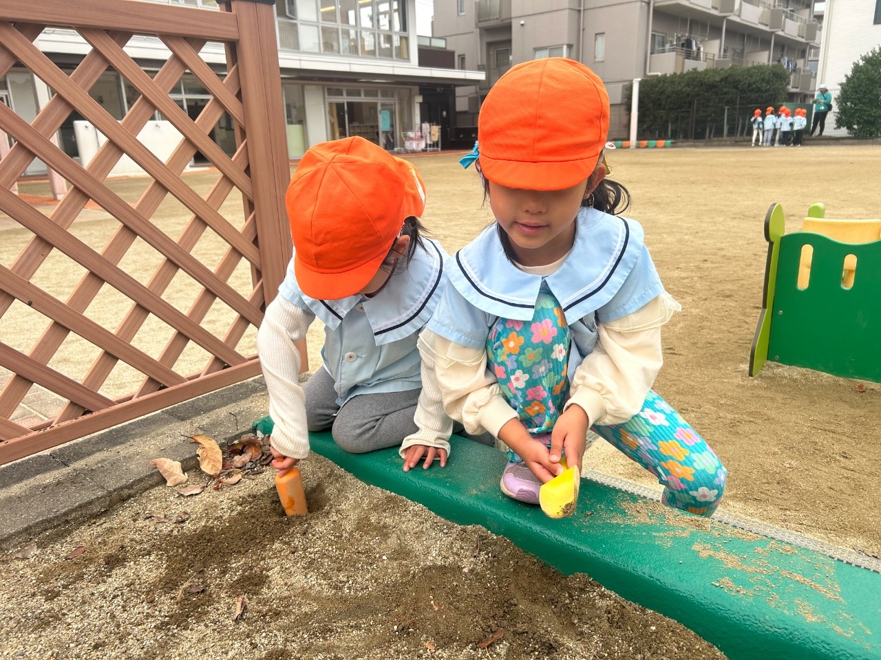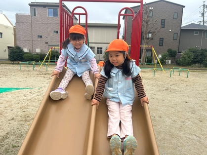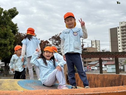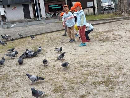四条公園へ散歩に行きました。黄色のドーム型の遊具に勢いをつけて友だちと走っていき一緒に登ったり、鳩がたくさん集まっているのにとても興味津々で「あのはと、しろいよ!」「なにたべてるのかな?」とじっと観察していました。