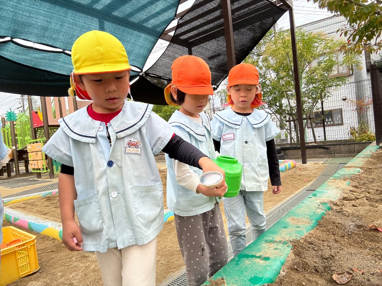 園庭の花壇にチューリップを植えると、「なにいろのはながさくかな?」と楽しみにしていました。植えた次の日から芽が出るのを楽しみにしながら花壇を見て回っています。最近芽が出てきたものがあり、「ちゅーりっぷでてきた!」と教えてくれましたよ。