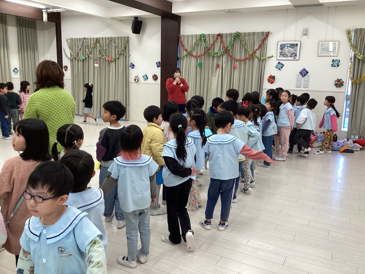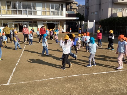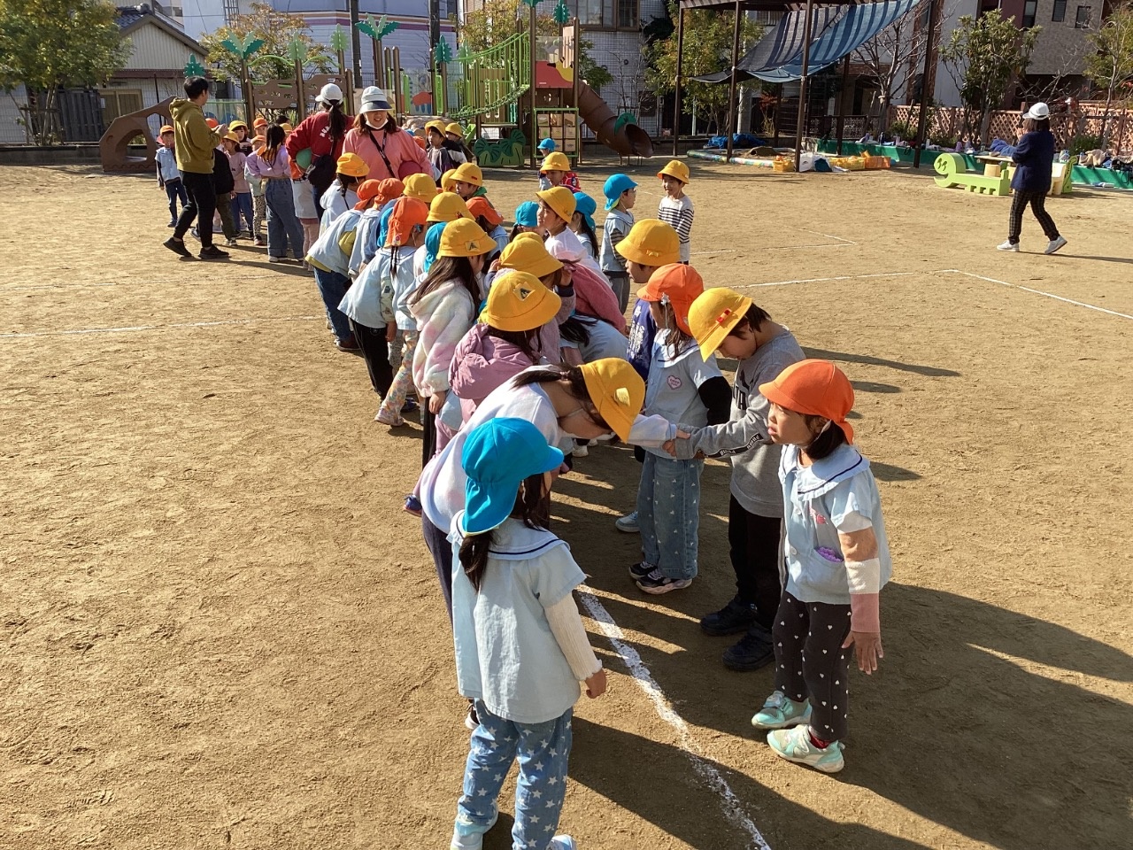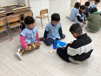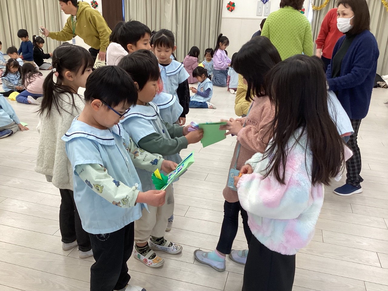 明治小学校の一年生が遊びに来てくれました。ちょっと恥ずかしそうにしながらも、自己紹介をしていた姿がとても可愛かったです。ぞう組さんからは『おむすびころりん』を発表しました。一年生からは、どんぐりごまとクリスマスカードをプレゼントしてもらいましたよ。一年生のお兄さん、お姉さんにこまの回し方のコツを教えてもらい、とっても嬉しそうに回していました。最後は、みんなでドッジボール!! 年中・年長・一年生の混合チームで戦いました。ぞう組さんも負けじとボールを投げて、頑張っていました。
