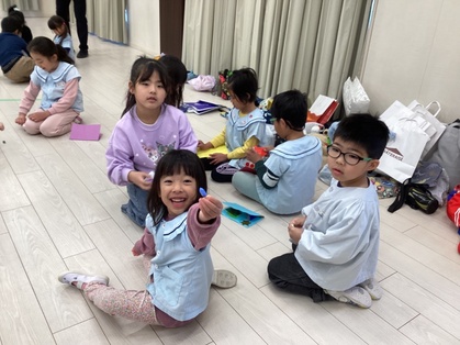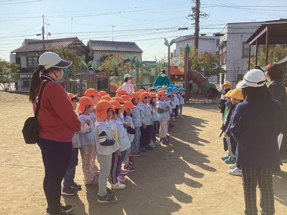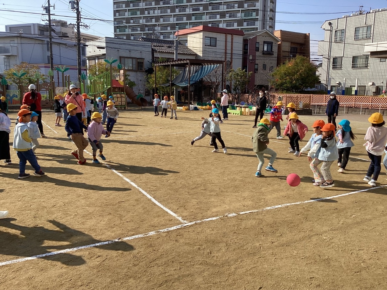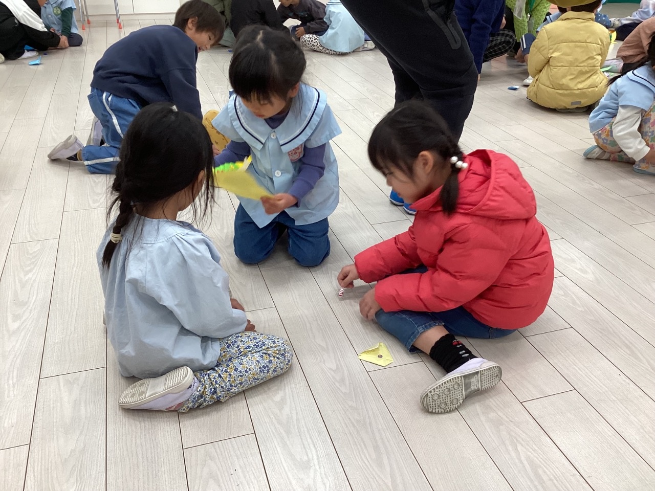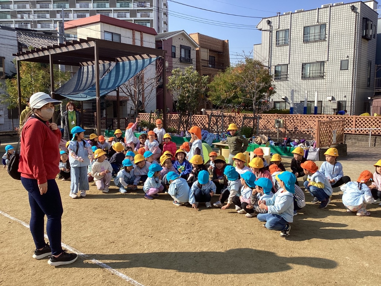 明治小学校の一年生が遊びに来てくれました。ちょっと恥ずかしそうにしながらも、自己紹介をしていた姿がとても可愛かったです。ぞう組さんからは『おむすびころりん』を発表しました。一年生からは、どんぐりごまとクリスマスカードをプレゼントしてもらいましたよ。一年生のお兄さん、お姉さんにこまの回し方のコツを教えてもらい、とっても嬉しそうに回していました。最後は、みんなでドッジボール!! 年中・年長・一年生の混合チームで戦いました。ぞう組さんも負けじとボールを投げて、頑張っていました。