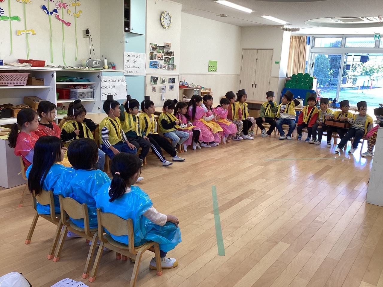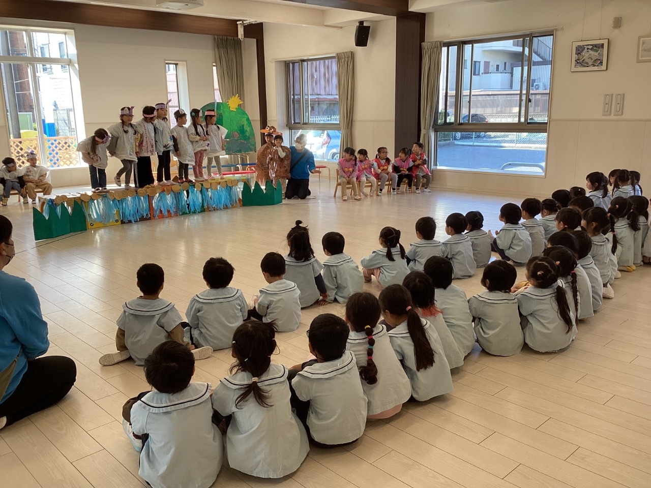 保育参観・懇談会に参加いただき、ありがとうございました。「こうしたらいいんじゃない?」と歌に合わせて踊りを考えてたり、歌も楽しそうに覚えたりして、素敵な『おむすびころりん』になりました。みんなと力を合わせて一緒に作った劇遊びは、また一つ楽しい思い出となりました。きりん組さんの『3匹のやぎのがらがらどん』を見せてもらい、お客さん側も楽しみました。